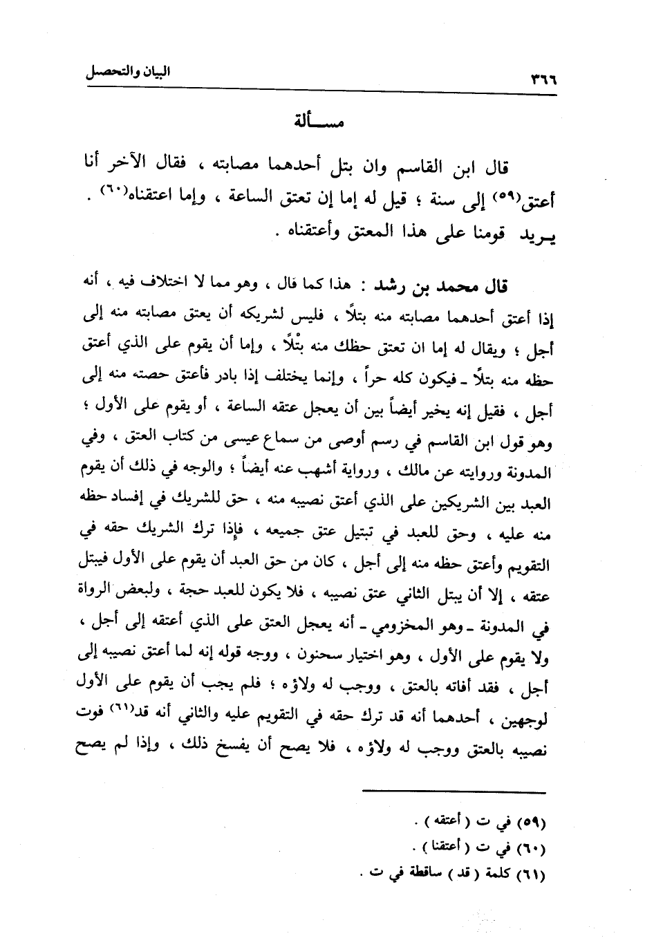 قال محمد بن رشد: هذا كما قال، وهو مما لا اختلاف فيه، أنه إذا أعتق أحدهما مصابته منه بتلا، فليس لشريكه أن يعتق مصابته منه إلى أجل؛ ويقال له: إما أن تعتق حظك منه بتلا، وإما أن يقوم على الذي أعتق حظه منه بتلا - فيكون كله حرا، وإنما يختلف إذا بادر فأعتق حصته منه إلى أجل، فقيل: إنه يخير أيضا بين أن يعجل عتقه الساعة، أو يقوم على الأول؛ وهو قول ابن القاسم في رسم أوصى من سماع عيسى من كتاب العتق، وفي المدونة وروايته عن مالك، ورواية أشهب عنه أيضا؛ والوجه في ذلك أن يقوم العبد بين الشريكين على الذي أعتق نصيبه منه، حق للشريك في إفساد حظه منه عليه، وحق للعبد في تبتيل عتق جميعه، فإذا ترك الشريك حقه في التقويم وأعتق حظه منه إلى أجل، كان من حق العبد أن يقوم على الأول فيبتل عتقه، إلا أن يبتل الثاني عتق نصيبه، فلا يكون للعبد حجة، ولبعض الرواة في المدونة - وهو المخزومي - أنه يعجل العتق على الذي أعتقه إلى أجل، ولا يقوم على الأول، وهو اختيار سحنون، ووجه قوله: إنه لما أعتق نصيبه إلى أجل، فقد أفاته بالعتق، ووجب له ولاؤه؛ فلم يجب أن يقوم على الأول لوجهين، أحدهما: أنه قد ترك حقه في التقويم عليه، والثاني: أنه قد فوت نصيبه بالعتق ووجب له ولاؤه، فلا يصح أن يفسخ ذلك، وإذا لم يصح