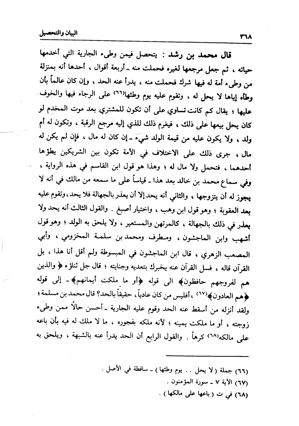 قال محمد بن رشد: يتحصل فيمن وطئ الجارية التي أخدمها حياته، ثم جعل مرجعها لغيره فحملت منه- أربعة أقوال، أحدها: أنه بمنزلة من وطئ أمة له فيها شرك فحملت منه، يدرأ عنه الحد، وإن كان عالما بأن وطأه إياها لا يحل له، وتقوم عليه يوم وطئها على الرجاء فيها والخوف عليه؛ يقال: كم كانت تساوي على أن تكون للمشتري بعد موت المخدم لو كان يحل بيعها على ذلك، فيغرم ذلك للذي إليه مرجع الرقبة، وتكون له أم ولد، ولا يكون عليه من قيمة الولد شيء - إن كان له مال، فإن لم يكن له مال، جرى ذلك على الاختلاف في الأمة تكون بين الشريكين يطؤها أحدهما، فتحمل ولا مال له. وهذا هو قول ابن القاسم في هذه الرواية، وفي سماع محمد بن خالد بعد هذا- قياسا على ما سمعه من مالك في أنه لا يجوز له أن يتزوجها، والثاني: أنه يحد إلا أن يعذر بالجهالة فلا يحد، وتقوم عليه بعد العقوبة؛ وهو قول ابن وهب، واختيار أصبغ. والقول الثالث: أنه يحد ولا يعذر في ذلك بالجهالة، كالمرتهن والمستعير، ولا يلحق به الولد؛ وهو قول أشهب وابن الماجشون، ومطرف ومحمد بن سلمة المخزومي، وأبي المصعب الزهري، قال ابن الماجشون في المبسوطة: ولم أقل أنا هذا، بل القرآن قاله، فسل القرآن عنه يخبرك بتعديه وجنايته، قال جل ثناؤه: {وَالَّذِينَ هُمْ لِفُرُوجِهِمْ حَافِظُونَ} [المؤمنون: 5] إلى قوله: {أوْ مَا مَلَكَتْ أَيْمَانُهُمْ} [المؤمنون: 6]- إلى قوله: {هُمُ الْعَادُونَ} [المؤمنون: 7] ، أفليس من كان عاديا، حقيقا بالحد؟ قال محمد بن مسلمة؛ ولقد أنزله من أسقط عنه الحد وقوم عليه الجارية - أحسن حالا ممن وطئ زوجته، أو ما ملكت يمينه؛ لأنه ملكه بفجوره، ما لا ملك له فيه بأن باعه على مالكه كرها. والقول الرابع: أن الحد يدرأ عنه بالشبهة، ويلحق به