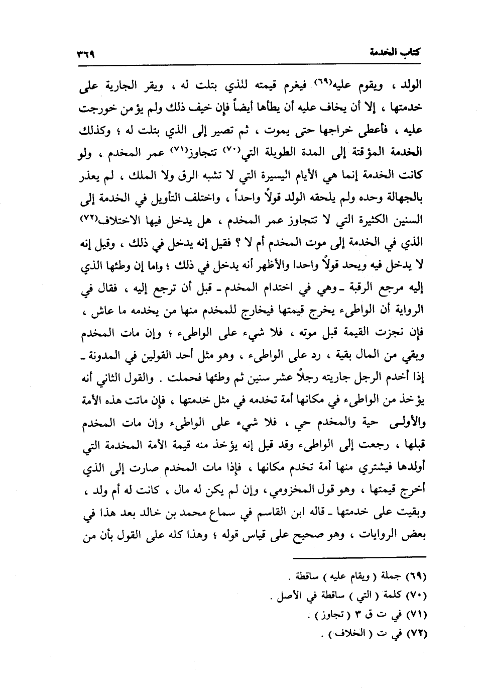 الولد، ويقوم عليه فيغرم قيمته للذي بتلت له، ويقر الجارية على خدمتها، إلا أن يخاف عليه أن يطأها أيضا فإن خيف ذلك ولم يؤمن خورجت عليه، فأعطى خراجها حتى يموت، ثم تصير إلى الذي بتلت له؛ وكذلك الخدمة المؤقتة إلى المدة الطويلة التي تتجاوز عمر المخدم، ولو كانت الخدمة إنما هي الأيام اليسيرة التي لا تشبه الرق ولا الملك، لم يعذر بالجهالة وحده ولم يلحقه الولد قولا واحدا، واختلف التأويل في الخدمة إلى السنين الكثيرة التي لا تتجاوز عمر المخدم، هل يدخل فيها الاختلاف الذي في الخدمة إلى موت المخدم أم لا؟ فقيل: إنه يدخل في ذلك، وقيل: إنه لا يدخل فيه ويحد قولا واحدا، والأظهر أنه يدخل في ذلك، وأما إن وطئها الذي إليه مرجع الرقبة- وهي في اختدام المخدم- قبل أن ترجع إليه، فقال في الرواية: إن الواطئ يخرج قيمتها فيخارج للمخدم منها من يخدمه ما عاش، فإن نجزت القيمة قبل موته، فلا شيء على الواطئ؛ وإن مات المخدم وبقي من المال بقية، رد على الواطئ، وهو مثل أحد القولين في المدونة - إذا أخدم الرجل جاريته رجلا عشر سنين ثم وطئها فحملت. والقول الثاني: أنه يؤخذ من الواطئ في مكانها أمة تخدمه في مثل خدمتها، فإن ماتت هذه الأمة والأولى حية والمخدم حي، فلا شيء على الواطئ، وإن مات المخدم قبلها، رجعت إلى الواطئ وقد قيل: إنه يؤخذ منه قيمة الأمة المخدمة التي أولدها فيشتري منها أمة تخدم مكانها، فإذا مات المخدم صارت إلى الذي أخرج قيمتها، وهو قول المخزومي، وإن لم يكن له مال، كانت له أم ولد، وبقيت على خدمتها- قاله ابن القاسم في سماع محمد بن خالد بعد هذا في بعض الروايات، وهو صحيح على قياس قوله؛ وهذا كله على القول بأن من