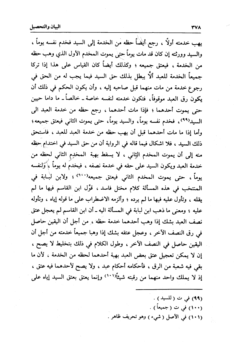 يهب خدمته أولا، رجع أيضا حظه من الخدمة إلى السيد فخدم نفسه يوما، والسيد وورثته إن كان قد مات يوما حتى يموت المخدم الأول الذي وهب حظه من الخدمة، فيعتق جميعه؛ وكذلك أيضا كان القياس على هذا إذا تركا جميعا الخدمة للعبد ألا يبطل بذلك حق السيد فيما يجب له من الحق في رجوع خدمة من مات منهما قبل صاحبه إليه، وأن يكون الحكم في ذلك أن يكون رق العبد موقوفا، فتكون خدمته لنفسه خاصة- خالصا- ما داما حيين حتى يموت أحدهما؛ فإذا مات أحدهما، رجع حظه من خدمة العبد إلى السيد، فخدم نفسه يوما، والسيد يوما، حتى يموت الثاني فيعتق جميعه؛ وأما إذا ما مات أحدهما قبل أن يهب حظه من خدمة العبد للعبد، فاستحق ذلك السيد، فلا إشكال فيما قاله في الرواية أن من حق السيد في اختدام حظه منه إلى أن يموت المخدم الثاني، لا يسقط بهبة المخدم الثاني لحظه من خدمة العبد ويكون السيد على حقه في خدمة نصفه، فيخدم له يوما، ولنفسه يوما، حتى يموت المخدم الثاني فيعتق جميعه؛ ولابن لبابة في المنتخب في هذه المسألة كلام مختل فاسد، قول ابن القاسم فيها ما لم يقله، وتأول عليه فيها ما لم يرده؛ وألزمه الاضطراب على ما قوله إياه، وتأوله عليه؛ ومعنى ما ذهب ابن لبابة في المسألة إليه- أن ابن القاسم لم يعجل عتق نصف العبد بشك إذا وهب أحدهما خدمة حظه، من أجل أن اليقين حاصل في رق النصف الآخر، وعجل عتقه بشك إذا وهبا جميعا خدمته من أجل أن اليقين حاصل في النصف الآخر، وطول الكلام في ذلك بتخليط لا يصح، إن لا يمكن تعجيل عتق بعض العبد بهبة أحدهما لحظه من الخدمة؛ لأن ما بقي فيه شعبة من الرق، فأحكامه أحكام عبد، ولا يصح لأحدهما فيه عتق، إذ لا يملك واحد منهما من رقبته شيئا وإنما يعتق بعتق السيد إياه على