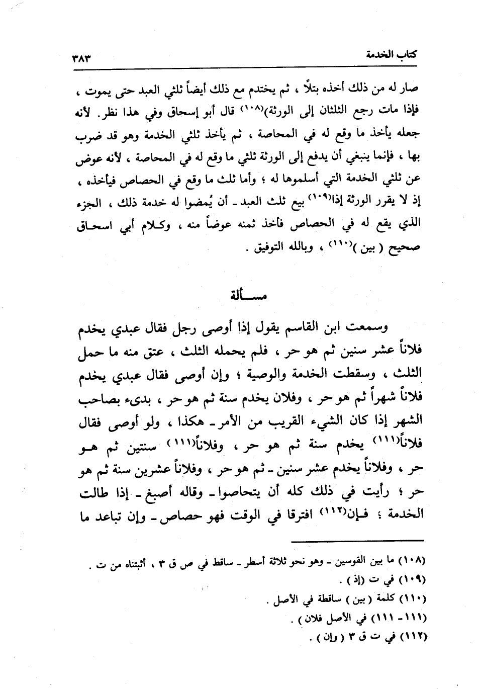 صار له من ذلك أخذه بتلا، ثم يختدم مع ذلك أيضا ثلثي العبد حتى يموت، فإذا مات رجع الثلثان إلى الورثة) . قال أبو إسحاق: وفي هذا نظر؛ لأنه جعله يأخذ ما وقع له في المحاصة، ثم يأخذ ثلثي الخدمة وهو قد ضرب بها، فإنما ينبغي أن يدفع إلى الورثة ثلثي ما وقع له في المحاصة، لأنه عوض عن ثلثي الخدمة التي أسلموها له؛ وأما ثلث ما وقع في الحصاص فيأخذه، إذ لا يقرر الورثة إذا بيع ثلث العبد- أن يمضوا له خدمة ذلك، الجزء الذي يقع له في الحصاص فأخذ ثمنه عوضا منه، وكلام أبي إسحاق صحيح (بين) ، وبالله التوفيق.