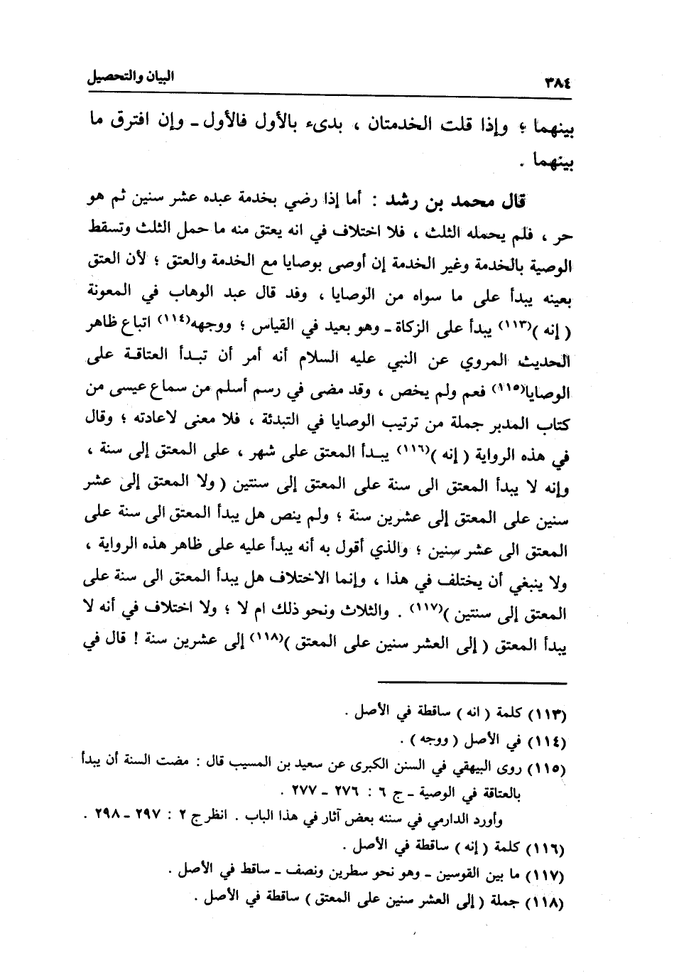 قال محمد بن رشد: أما إذا رضي بخدمة عبده عشر سنين ثم هو حر، فلم يحمله الثلث، فلا اختلاف في أنه يعتق منه ما حمل الثلث وتسقط الوصية بالخدمة وغير الخدمة إن أوصى بوصايا مع الخدمة والعتق؛ لأن العتق بعينه يبدأ على ما سواه من الوصايا، وقد قال عبد الوهاب في المعونة (إنه) يبدأ على الزكاة- وهو بعيد في القياس؛ ووجهه اتباع ظاهر الحديث المروي عن النبي - عَلَيْهِ السَّلَامُ - أنه أمر أن تبدأ العتاقة على الوصايا فعم ولم يخص، وقد مضى في رسم أسلم من سماع عيسى من كتاب المدبر جملة من ترتيب الوصايا في التبدئة، فلا معنى لإعادته؛ وقال في هذه الرواية: (إنه) يبدأ المعتق على شهر، على المعتق إلى سنة، وإنه لا يبدأ المعتق إلى سنة على المعتق إلى سنتين (ولا المعتق إلى عشر سنين على المعتق إلى عشرين سنة؛ ولم ينص هل يبدأ المعتق إلى سنة على المعتق إلى عشر سنين؛ والذي أقول به أنه يبدأ عليه على ظاهر هذه الرواية، ولا ينبغي أن يختلف في هذا، وإنما الاختلاف هل يبدأ المعتق إلى سنة على المعتق إلى سنتين) . والثلاث ونحو ذلك أم لا؛ ولا اختلاف في أنه لا يبدأ المعتق (إلى العشر سنين على المعتق) إلى عشرين سنة قال في