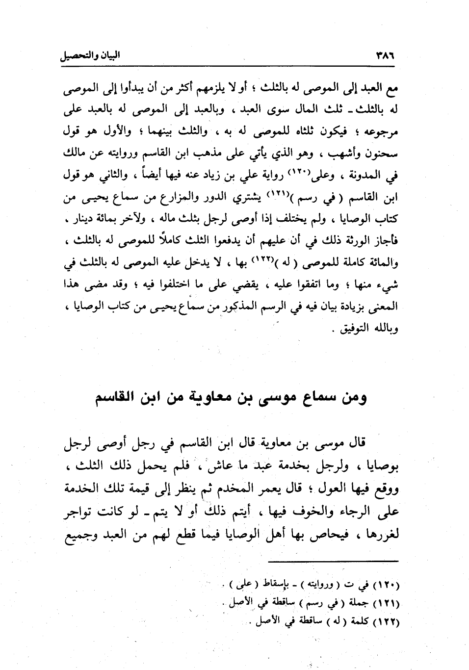 ومن سماع موسى بن معاوية من ابن القاسم قال موسى بن معاوية: قال ابن القاسم في رجل أوصى لرجل بوصايا، ولرجل بخدمة عبد ما عاش، فلم يحمل ذلك الثلث، ووقع فيها العول، قال: يعمر المخدم ثم ينظر إلى قيمة تلك الخدمة على الرجاء والخوف فيها، أيتم ذلك أو لا يتم- لو كانت تواجر لغررها، فيحاص بها أهل الوصايا فيما قطع لهم من العبد وجميع