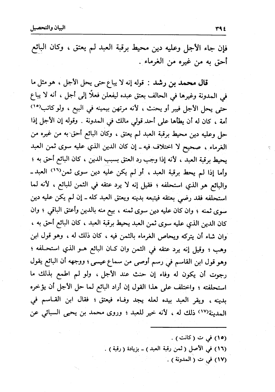 قال محمد بن رشد: قوله: إنه لا يباع حتى يحل الأجل، هو مثل ما في المدونة وغيرها في الحالف بعتق عبده ليفعلن فعلا إلى أجل، أنه لا يباع حتى يحل الأجل فيبر أو يحنث؛ لأنه مرتهن بيمينه في البيع، ولو كاتب أمة، كان له أن يطأها على أحد قولي مالك في المدونة، وقوله: إن الأجل إذا حل وعليه دين محيط برقبة العبد لم يعتق، وكان البائع أحق به من غيره من الغرماء، صحيح لا اختلاف فيه- إن كان الدين الذي عليه سوى ثمن العبد يحيط برقبة العبد؛ لأنه إذا وجب رد العتق بسبب الدين، كان البائع أحق به، وأما إذا لم يحط برقبة العبد، أو لم يكن عليه دين سوى ثمن العبد- والبائع هو الذي استحلفه، فقيل: إنه لا يرد عتقه في الثمن للبائع؛ لأنه لما استحلفه فقد رضي بعتقه فيتبعه بدينه ويعتق العبد كله- إن لم يكن عليه دين سوى ثمنه، وإن كان عليه دين سوى ثمنه، بيع منه بالدين وأعتق الباقي، وإن كان الدين الذي عليه سوى ثمن العبد يحيط برقبة العبد، كان البائع أحق به، وإن شاء أن يتركه ويحاص الغرماء بالثمن فيه، كان ذلك له، وهو قول ابن وهب، وقيل: إنه يرد عتقه في الثمن، وإن كان البائع هو الذي استحلفه، وهو قول ابن القاسم في رسم أوصى من سماع عيسى، ووجهه أن البائع يقول: رجوت أن يكون له وفاء إن حنث عند الأجل، ولو لم أطمع بذلك ما استحلفته، واختلف على هذا القول إن أراد البائع لما حل الأجل أن يؤخره بدينه، ويقر العبد بيده لعله يجد وفاء فيعتق، فقال ابن القاسم في المدونة: ذلك له؛ لأنه خير للعبد، وروى محمد بن يحيى السبائي عن