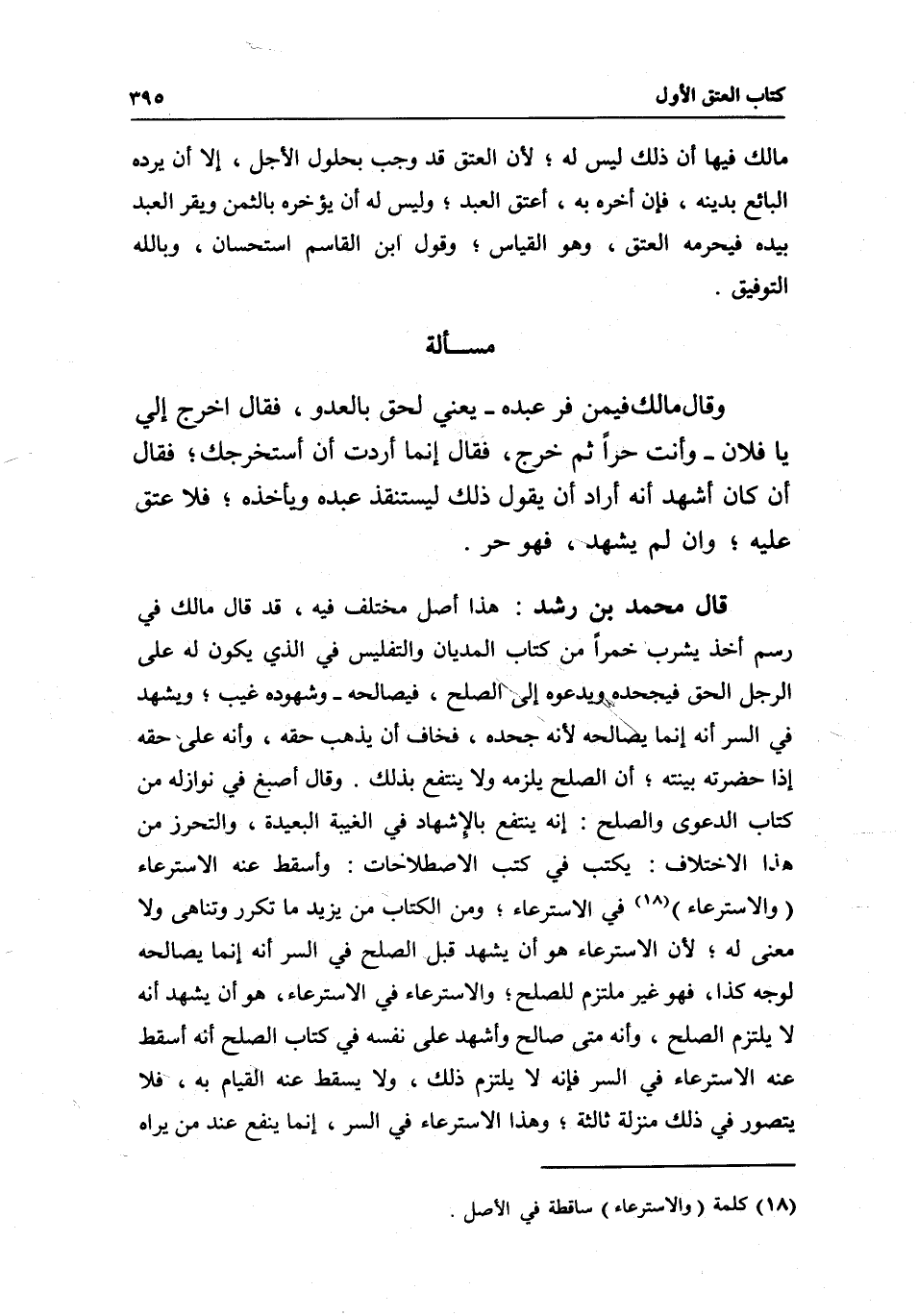 قال محمد بن رشد: هذا أصل مختلف فيه، قد قال مالك في رسم أخذ يشرب خمرا من كتاب المديان والتفليس في الذي يكون له على الرجل الحق فيجحده ويدعوه إلى الصلح، فيصالحه وشهوده غُيَّب ويشهد في السر أنه إنما يصالحه؛ لأنه جحده، فخاف أن يذهب حقه، وأنه على حقه إذا حضرته بينته، أن الصلح يلزمه ولا ينتفع بذلك، وقال أصبغ في نوازله من كتاب الدعوى والصلح: إنه ينتفع بالإشهاد في الغيبة البعيدة، والتحرز من هذا الاختلاف: يكتب في كتب الاصطلاحات: وأسقط عنه الاسترعاء (والاسترعاء) في الاسترعاء، ومن الكتاب من يزيد ما تكرر وتناهى ولا معنى له؛ لأن الاسترعاء هو أن يشهد قبل الصلح في السر أنه إنما يصالحه لوجه كذا، فهو غير ملتزم للصلح، والاسترعاء في الاسترعاء، هو أن يشهد أنه لا يلتزم الصلح، وأنه متى صالح وأشهد على نفسه في كتاب الصلح أنه أسقط عنه الاسترعاء في السر فإنه لا يلتزم ذلك، ولا يسقط عنه القيام به، فلا يتصور في ذلك منزلة ثالثة، وهذا الاسترعاء في السر، إنما ينفع عند من يراه