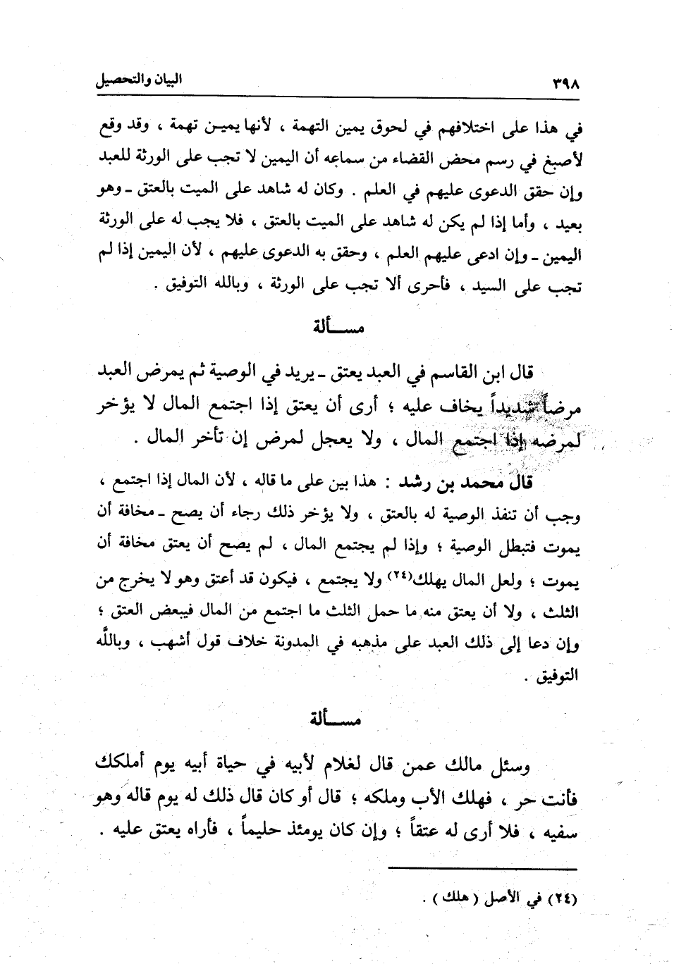 مسألة وسئل مالك: عمن قال لغلام لأبيه في حياة أبيه: يوم أملكك فأنت حر، فهلك الأب وملكه، قال: أو كان قال ذلك له يوم قاله وهو سفيه، فلا أرى له عتقا، وإن كان يومئذ حليما، فأراه يعتق عليه.