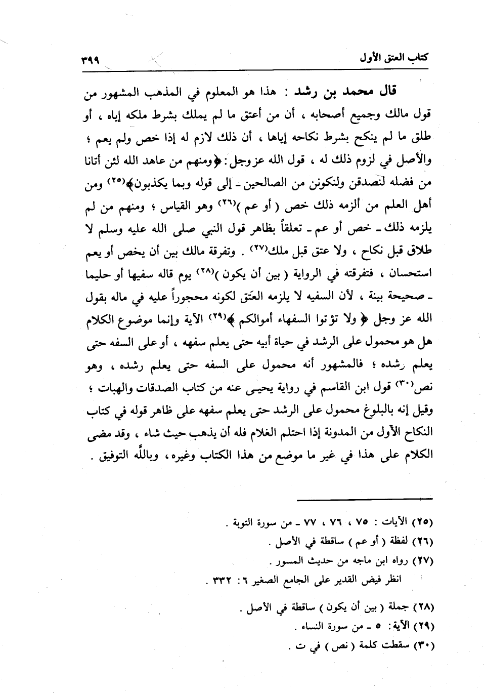 قال محمد بن رشد: هذا هو المعلوم في المذهب المشهور من قول مالك وجميع أصحابه، أن من أعتق ما لم يملك بشرط ملكه إياه، أو طلق ما لم ينكح بشرط نكاحه إياها، أن ذلك لازم له إذا خص ولم يعم، والأصل في لزوم ذلك له، قول الله عز وجل: {وَمِنْهُمْ مَنْ عَاهَدَ اللَّهَ لَئِنْ آتَانَا مِنْ فَضْلِهِ لَنَصَّدَّقَنَّ وَلَنَكُونَنَّ مِنَ الصَّالِحِينَ} [التوبة: 75] إلى قوله {وَبِمَا كَانُوا يَكْذِبُونَ} [التوبة: 77] ومن أهل العلم من ألزمه ذلك خص (أو عم) وهو القياس، ومنهم من لم يلزمه ذلك- خص أو عم- تعلقا بظاهر قول النبي - صَلَّى اللَّهُ عَلَيْهِ وَسَلَّمَ -: «لا طلاق قبل نكاح، ولا عتق قبل ملك» وتفرقة مالك بين أن يخص أو يعم استحسان، فتفرقته في الرواية (بين أن يكون) يوم قاله سفيها أو حليما - صحيحة بينة؛ لأن السفيه لا يلزمه العتق لكونه محجورا عليه في ماله بقول الله عز وجل: {وَلا تُؤْتُوا السُّفَهَاءَ أَمْوَالَكُمُ} [النساء: 5] الآية وإنما موضوع الكلام هل هو محمول على الرشد في حياة أبيه حتى يعلم سفهه، أو على السفه حتى يعلم رشده، فالمشهور أنه محمول على السفه حتى يعلم رشده، وهو نص قول ابن القاسم في رواية يحيى عنه من كتاب الصدقات والهبات، وقيل: إنه بالبلوغ محمول على الرشد حتى يعلم سفهه على ظاهر قوله في كتاب النكاح الأول من المدونة إذا احتلم الغلام فله أن يذهب حيث شاء، وقد مضى الكلام على هذا في غير ما موضع من هذا الكتاب وغيره، وبالله التوفيق.
