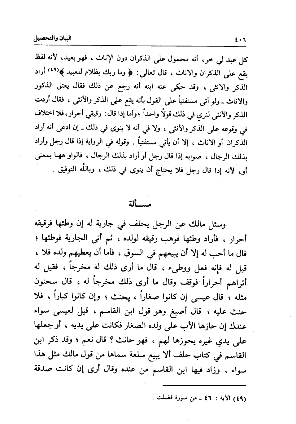 كل عبد لي حر، أنه محمول على الذكران دون الإناث، فهو بعيد؛ لأنه لفظ يقع على الذكران والإناث، قال تعالى: {وَمَا رَبُّكَ بِظَلامٍ لِلْعَبِيدِ} [فصلت: 46] أراد الذكر والأنثى، وقد حكى عنه ابنه أنه رجع عن ذلك فقال: يعتق الذكور والإناث- ولو أتى مستفتيا على القول بأنه يقع على الذكر والأنثى، فقال: أردت الذكر والأنثى لنرى في ذلك قولا واحدا، وأما إذا قال: رقيقي أحرار، فلا اختلاف في وقوعه على الذكر والأنثى، ولا في أنه لا ينوى في ذلك- إن ادعى أنه أراد الذكران أو الإناث، إلا أن يأتي مستفتيا، وقوله في الرواية: إذا قال رجل وأراد بذلك الرجال، صوابه إذا قال رجل أو أراد بذلك الرجال، فالواو ههنا بمعنى أو؛ لأنه إذا قال رجل فلا يحتاج أن ينوى في ذلك، وبالله التوفيق.