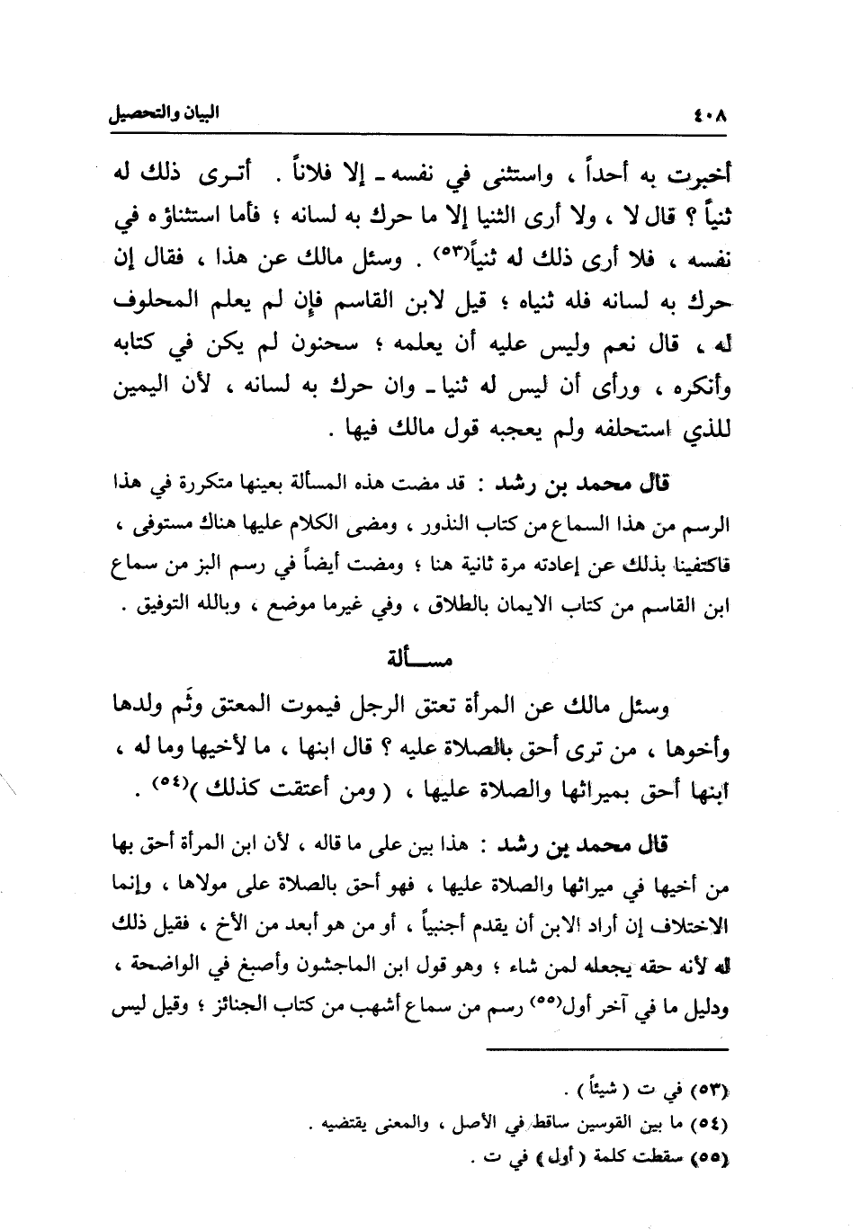 قال محمد بن رشد: قد مضت هذه المسألة بعينها متكررة في هذا الرسم من هذا السماع من كتاب النذور، ومضى الكلام عليها هناك مستوفى، فاكتفينا بذلك عن إعادته مرة ثانية هنا، ومضت أيضا في رسم البز من سماع ابن القاسم من كتاب الأيمان بالطلاق، وفي غير ما موضع، وبالله التوفيق.