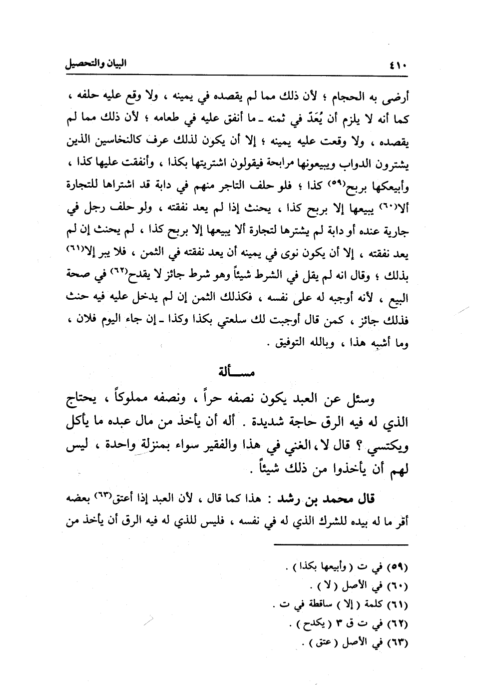 أرضى به الحجام؛ لأن ذلك مما لم يقصده في يمينه، ولا وقع عليه حلفه، كما أنه لا يلزم أن يعد في ثمنه- ما أنفق عليه في طعامه؛ لأن ذلك مما لم يقصده، ولا وقعت عليه يمينه، إلا أن يكون لذلك عرف كالنخاسين الذين يشترون الدواب ويبيعونها مرابحة فيقولون: اشتريتها بكذا، وأنفقت عليها كذا، وأبيعكها بربح كذا، فلو حلف التاجر منهم في دابة قد اشتراها للتجارة ألا يبيعها إلا بربح كذا، يحنث إذا لم يعد نفقته، ولو حلف رجل في جارية عنده أو دابة لم يشترها لتجارة ألا يبيعها إلا بربح كذا، لم يحنث إن لم يعد نفقته، إلا أن يكون نوى في يمينه أن يعد نفقته في الثمن، فلا يبر إلا بذلك، وقال: إنه لم يقل في الشرط شيئا وهو شرط جائز لا يقدح في صحة البيع؛ لأنه أوجبه له على نفسه، فكذلك الثمن إن لم يدخل عليه فيه حنث فذلك جائز، كمن قال: أوجبت لك سلعتي بكذا وكذا- إن جاء اليوم فلان، وما أشبه هذا، وبالله التوفيق.