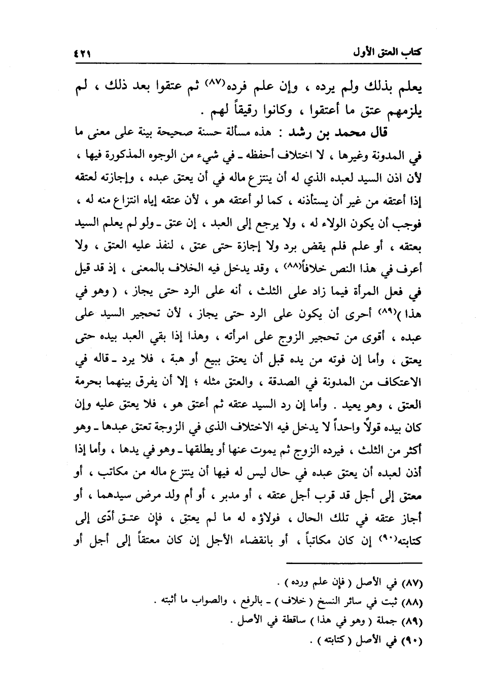 قال محمد بن رشد: هذه مسألة حسنة صحيحة بينة على معنى ما في المدونة وغيرها، لا اختلاف أحفظه- في شيء من الوجوه المذكورة فيها؛ لأن إذن السيد لعبده الذي له أن ينتزع ماله في أن يعتق عبده، وإجازته لعتقه إذا أعتقه من غير أن يستأذنه، كما لو أعتقه هو؛ لأن عتقه إياه انتزاع منه له، فوجب أن يكون الولاء له، ولا يرجع إلى العبد، إن عتق- ولو لم يعلم السيد بعتقه، أو علم فلم يقض برد ولا إجازة حتى عتق، لنفذ عليه العتق، ولا أعرف في هذا النص خلافا، وقد يدخل فيه الخلاف بالمعنى، إذ قد قيل في فعل المرأة فيما زاد على الثلث، أنه على الرد حتى يجاز، (وهو في هذا) أحرى أن يكون على الرد حتى يجاز؛ لأن تحجير السيد على عبده، أقوى من تحجير الزوج على امرأته، وهذا إذا بقي العبد بيده حتى يعتق، وأما إن فوته من يده قبل أن يعتق ببيع أو هبة، فلا يرد- قاله في الاعتكاف من المدونة في الصدقة، والعتق مثله، إلا أن يفرق بينهما بحرمة العتق، وهو يعيد، وأما إن رد السيد عتقه ثم أعتق هو، فلا يعتق عليه وإن كان بيده قولا واحدا لا يدخل فيه الاختلاف الذي في الزوجة تعتق عبدها- وهو أكثر من الثلث، فيرده الزوج ثم يموت عنها أو يطلقها- وهو في يدها، وأما إذا أذن لعبده أن يعتق عبده في حال ليس له فيها أن ينتزع ماله من مكاتب، أو معتق إلى أجل قد قرب أجل عتقه، أو مدبر، أو أم ولد مرض سيدهما، أو أجاز عتقه في تلك الحال، فولاؤه له ما لم يعتق، فإن عتق أدى إلى كتابته إن كان مكاتبا، أو بانقضاء الأجل إن كان معتقا إلى أجل أو