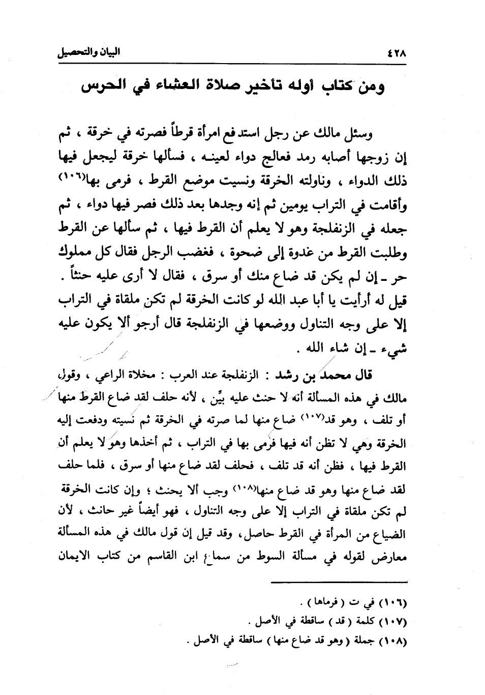 ومن كتاب أوله تأخير صلاة العشاء في الحرس وسئل مالك: عن رجل استدفع امرأة قرطا فصرته في خرقة، ثم إن زوجها أصابه رمد فعالج دواء لعينه، فسألها خرقة ليجعل فيها ذلك الدواء، وناولته الخرقة ونسيت موضع القرط، فرمى بها وأقامت في التراب يومين، ثم إنه وجدها بعد ذلك فصر فيها دواء، ثم جعله في الزنفلجة وهو لا يعلم أن القرط فيها، ثم سألها عن القرط وطلبت القرط من غدوة إلى ضحوة، فغضب الرجل فقال: كل مملوك حر- إن لم يكن قد ضاع منك أو سرق، فقال: لا أرى عليه حنثا.