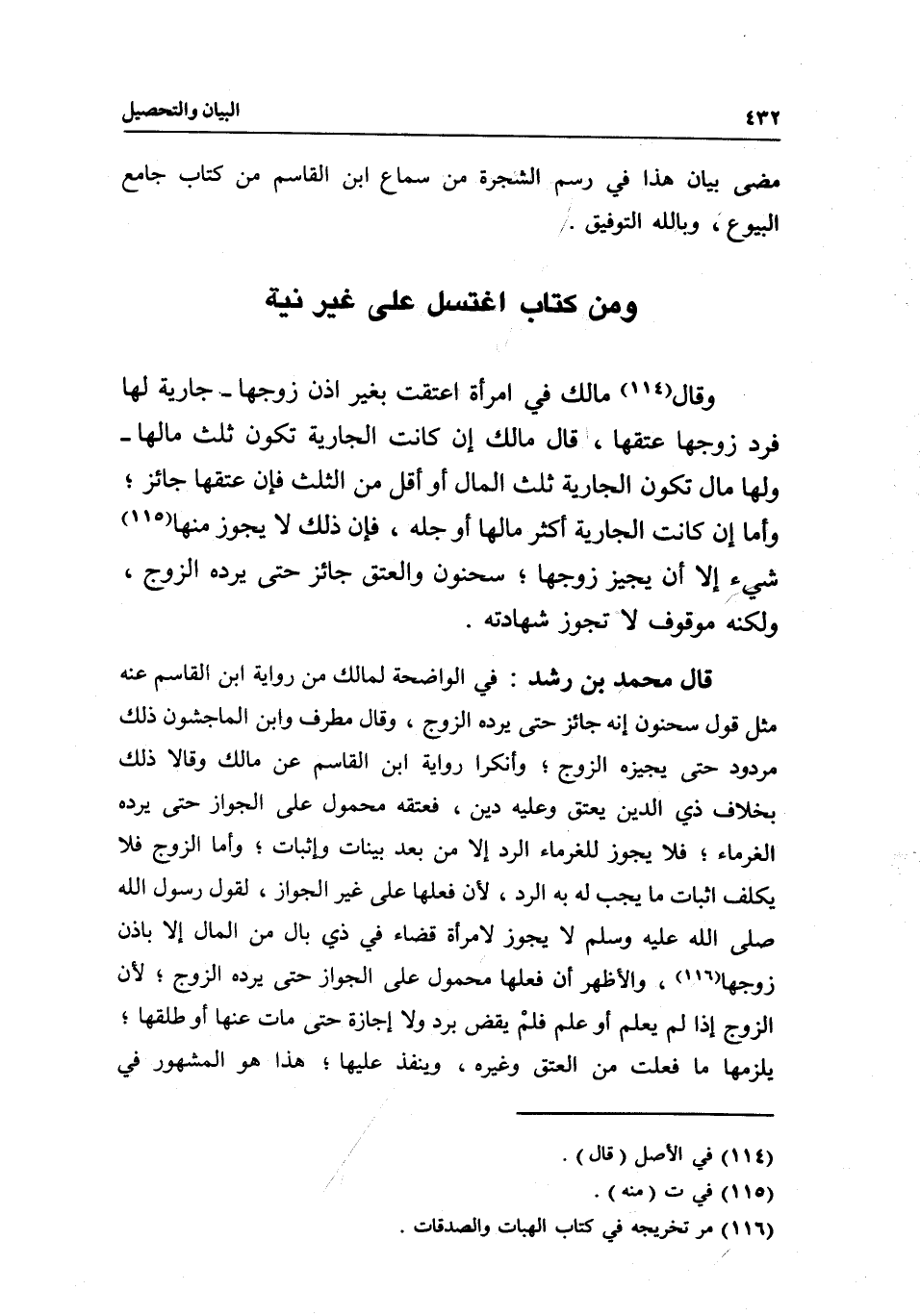 ومن كتاب اغتسل على غير نية وقال مالك في امرأة أعتقت بغير إذن زوجها- جارية لها فرد زوجها عتقها، قال مالك: إن كانت الجارية تكون ثلث مالها- ولها مال تكون الجارية ثلث المال أو أقل من الثلث فإن عتقها جائز، وأما إن كانت الجارية أكثر مالها أو جله، فإن ذلك لا يجوز منها شيء إلا أن يجيز زوجها، سحنون والعتق جائز حتى يرده الزوج، ولكنه موقوف لا تجوز شهادته.