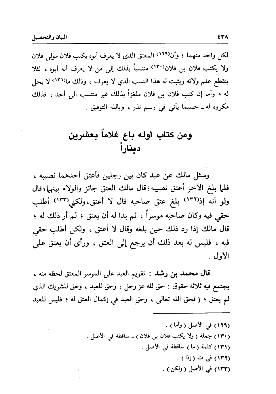 ومن كتاب أوله باع غلاما بعشرين دينارا وسئل مالك: عن عبد كان بين رجلين فأعتق أحدهما نصيبه، فلما بلغ الآخر أعتق نصيبه، قال مالك: العتق جائز والولاء بينهما، قال: ولو أنه إذ بلغ عتق صاحبه قال: لا أعتق، ولكني أطلب حقي فيه وكان صاحبه موسرا، ثم بدا له أن يعتق، لم أر ذلك له، قال مالك: إذا رد ذلك حين بلغه وقال: لا أعتق، ولكن أطلب حقي فيه، فليس له بعد ذلك أن يرجع إلى العتق، ورأى أن يعتق على الأول.