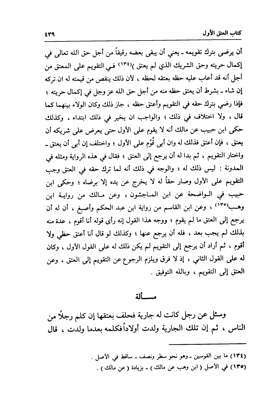 أن يرضى بترك تقويمه- يعني أن يبقى بعضه رقيقا من أجل حق الله تعالى في إكمال حريته وحق الشريك الذي لم يعتق) في التقويم على المعتق من أجل أنه قد أعاب عليه حظه بعتقه لحظه؛ لأن ذلك ينقص من قيمته له إن تركه إن شاء- بشرط أن يعتق حظه منه من أجل حق الله عز وجل في إكمال حريته، فإذا رضي بترك حقه في التقويم وأعتق حظه، جاز ذلك وكان الولاء بينهما كما قال، ولا اختلاف في ذلك، والواجب أن يخير في ذلك ابتداء، وكذلك حكى ابن حبيب عن مالك أنه لا يقوم على الأول حتى يعرض على شريكه أن يعتق، فإن أعتق فذلك له وإن أبى قوم على الأول، واختلف إن أبى أن يعتق- واختار التقويم، ثم بدا له أن يرجع إلى العتق، فقال في هذه الرواية ومثله في المدونة: ليس ذلك له، والوجه في ذلك أنه لما ترك حقه في العتق وجب التقويم على الأول وصار حقا له لا يخرج عن يده إلا برضاه، وحكى ابن حبيب في الواضحة عن ابن الماجشون، وعن مالك من رواية ابن وهب، وعن ابن القاسم من رواية ابن عبد الحكم وأصبغ، أن له أن يرجع إلى العتق ما لم يقوم، ووجه هذا القول إنه رأى قوله أنا أقوم، عدة منه بذلك لم يجب بعد، فله أن يرجع عنها، وكذلك لو قال: أنا أعتق حظي ولا أقوم، ثم أراد أن يرجع إلى التقويم لم يكن ذلك له على القول الأول، وكان له على القول الثاني، إذ لا فرق ويلزم الرجوع عن التقويم إلى العتق، وعن العتق إلى التقويم، وبالله التوفيق.
