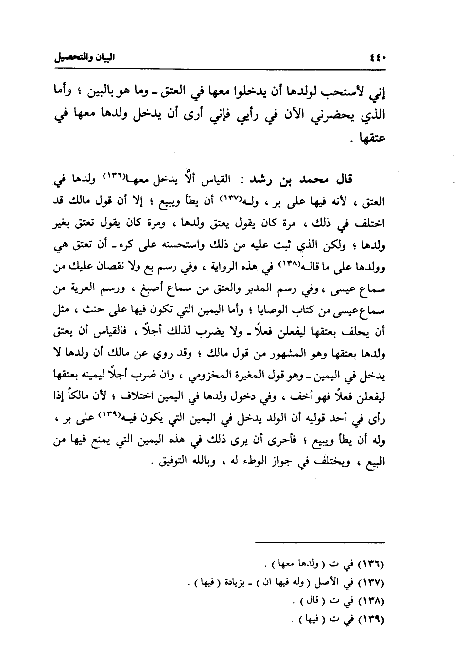 قال محمد بن رشد: القياس ألا يدخل معها ولدها في العتق؛ لأنه فيها على بر، وله أن يطأ ويبيع، إلا أن قول مالك قد اختلف في ذلك، مرة كان يقول يعتق ولدها، ومرة كان يقول تعتق بغير ولدها، ولكن الذي ثبت عليه من ذلك واستحسنه على كره- أن تعتق هي وولدها على ما قاله في هذه الرواية، وفي رسم بع ولا نقصان عليك من سماع عيسى، وفي رسم المدبر والعتق من سماع أصبغ، ورسم العرية من سماع عيسى من كتاب الوصايا، وأما اليمين التي تكون فيها على حنث، مثل أن يحلف بعتقها ليفعلن فعلا- ولا يضرب لذلك أجلا، فالقياس أن يعتق ولدها بعتقها وهو المشهور من قول مالك، وقد روي عن مالك أن ولدها لا يدخل في اليمين- وهو قول المغيرة المخزومي، وإن ضرب أجلا ليمينه بعتقها ليفعلن فعلا فهو أخف، وفي دخول ولدها في اليمين اختلاف؛ لأن مالكا إذا رأى في أحد قوليه أن الولد يدخل في اليمين التي يكون فيه على بر، وله أن يطأ ويبيع، فأحرى أن يرى ذلك في هذه اليمين التي يمنع فيها من البيع، ويختلف في جواز الوطء له، وبالله التوفيق.