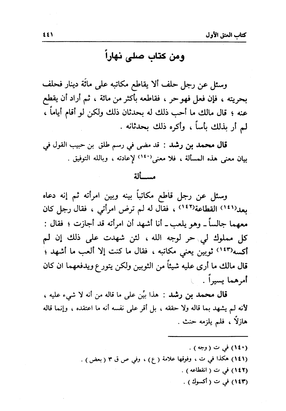 ومن كتاب صلى نهارا وسئل: عن رجل حلف إلا يقاطع مكاتبه على مائة دينار فحلف بحريته، فإن فعل فهو حر، فقاطعه بأكثر من مائة، ثم أراد أن يقطع عنه، قال مالك: ما أحب ذلك له بحدثان ذلك ولكن لو أقام أياما، لم أر بذلك بأسا، وأكره ذلك بحدثانه.