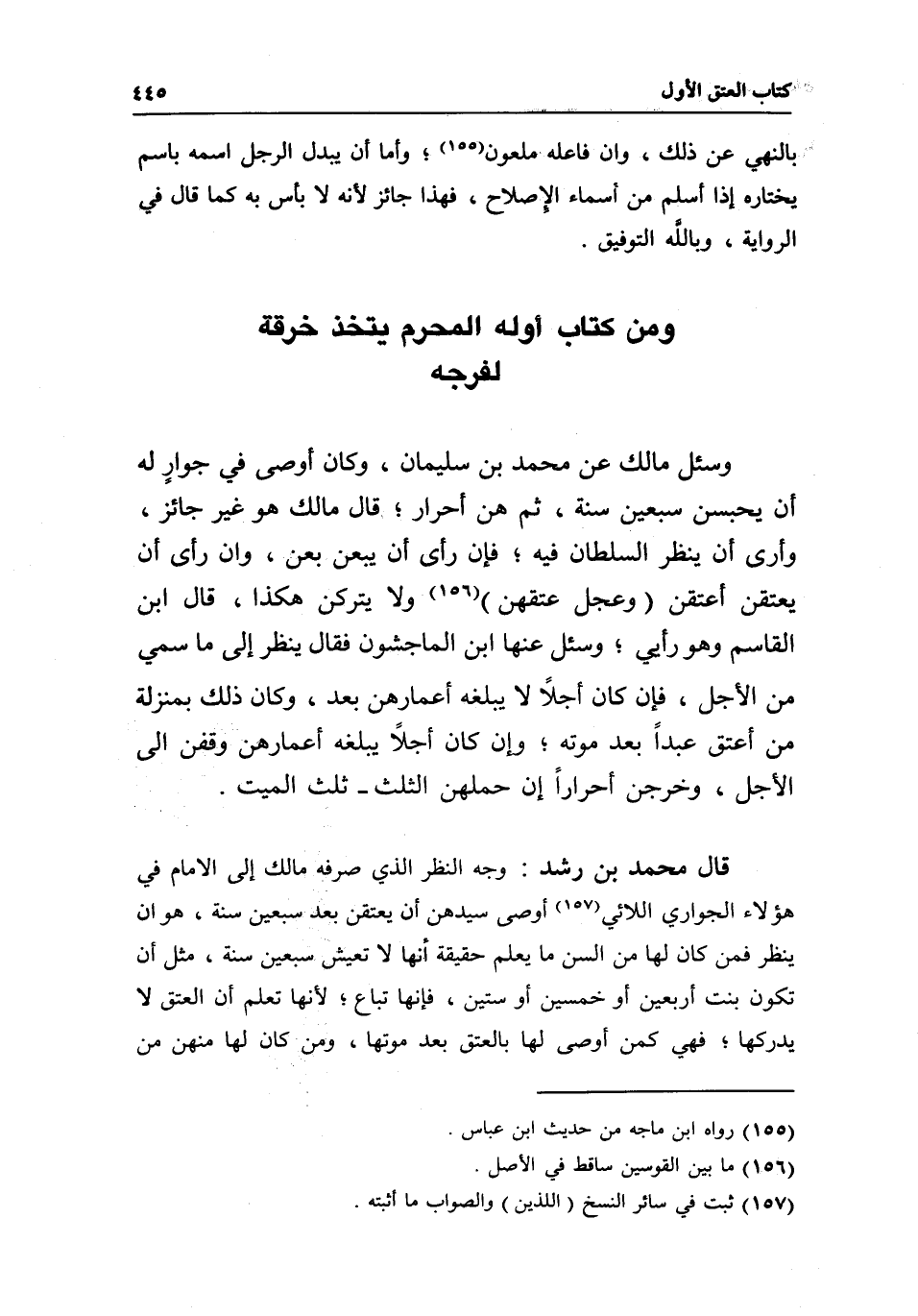 ومن كتاب أوله المحرم يتخذ خرقة لفرجه وسئل مالك: عن محمد بن سليمان، وكان أوصى في جوار له أن يحبسن سبعين سنة، ثم هن أحرار، قال مالك: هو غير جائز، وأرى أن ينظر السلطان فيه، فإن رأى أن يبعن بعن، وإن رأى أن يعتقن أعتقن (وعجل عتقهن) ولا يتركن هكذا، قال ابن القاسم وهو رأيي، وسئل عنها ابن الماجشون فقال: ينظر إلى ما سمي من الأجل، فإن كان أجلا لا يبلغه أعمارهن بعد، وكان ذلك بمنزلة من أعتق عبدا بعد موته، وإن كان أجلا يبلغه أعمارهن وقفن إلى الأجل، وخرجن أحرارا إن حملهن الثلث- ثلث الميت.