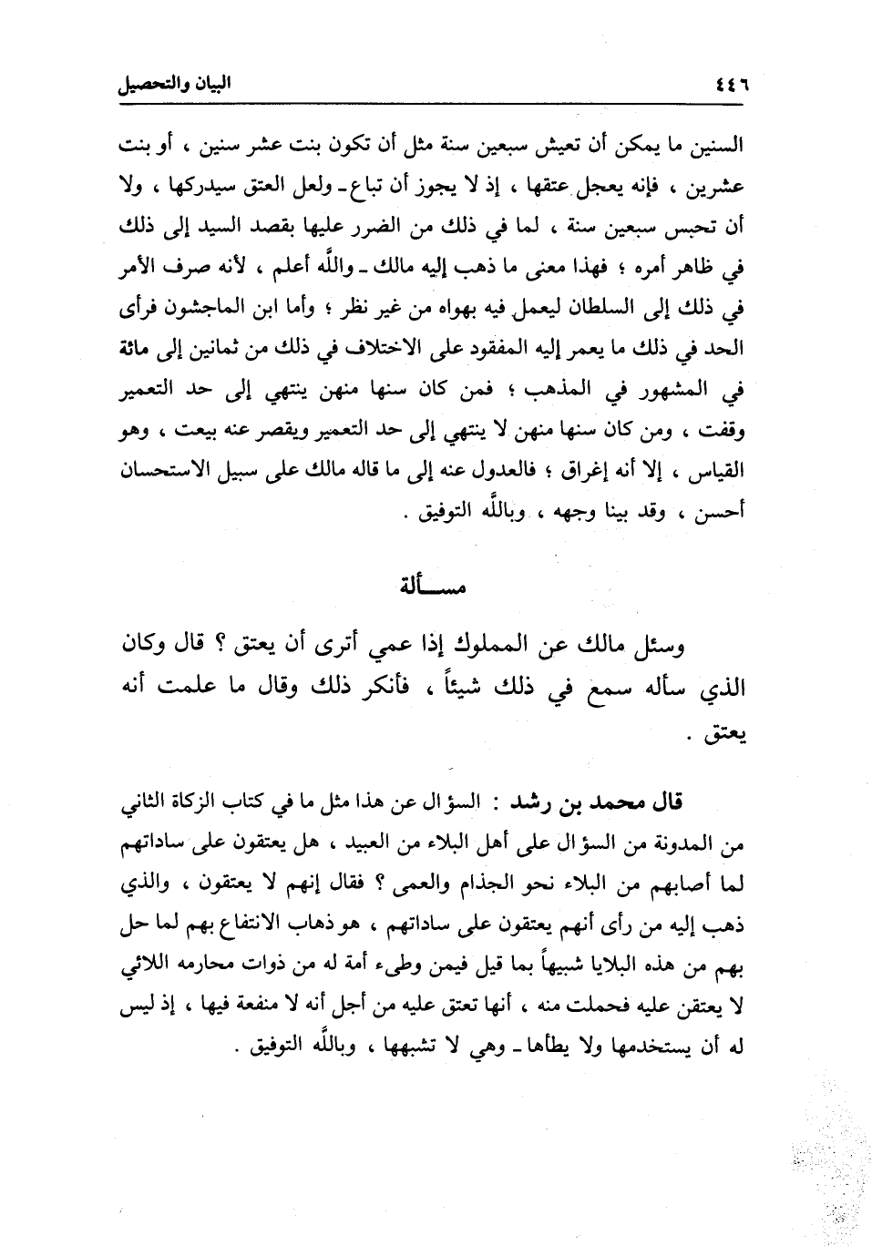 قال محمد بن رشد: السؤال عن هذا مثل ما في كتاب الزكاة الثاني من المدونة من السؤال على أهل البلاء من العبيد، هل يعتقون على ساداتهم لما أصابهم من البلاء نحو الجذام والعمى؟ فقال: إنهم لا يعتقون، والذي ذهب إليه من رأى أنهم يعتقون على ساداتهم، هو ذهاب الانتفاع بهم لما حل بهم من هذه البلايا شبيها بما قيل فيمن وطئ أمة له من ذوات محارمه اللائي لا يعتقن عليه فحملت منه، أنها تعتق عليه من أجل أنه لا منفعة فيها، إذ ليس له أن يستخدمها ولا يطأها- وهي لا تشبهها، وبالله التوفيق.