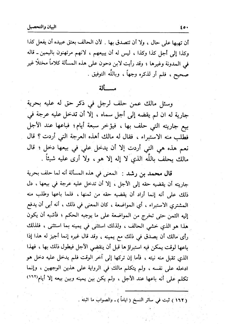 مسألة وسئل مالك عمن حلف لرجل في ذكر حق له عليه بحرية جارية له إن لم يقضه إلى أجل سماه، إلا أن تدخل عليه عرجة في بيع جاريته التي حلف بها، فيؤخر سبعة أيام، فباعها عند الأجل فطلب منه الاستبراء، فقال له مالك: أهذه العرجة التي أردت؟ قال: نعم هذه هي التي أردت إلا أن يدخل علي في بيعها دخل، قال مالك: يحلف بالله الذي لا إله إلا هو، ولا أرى عليه شيئا.