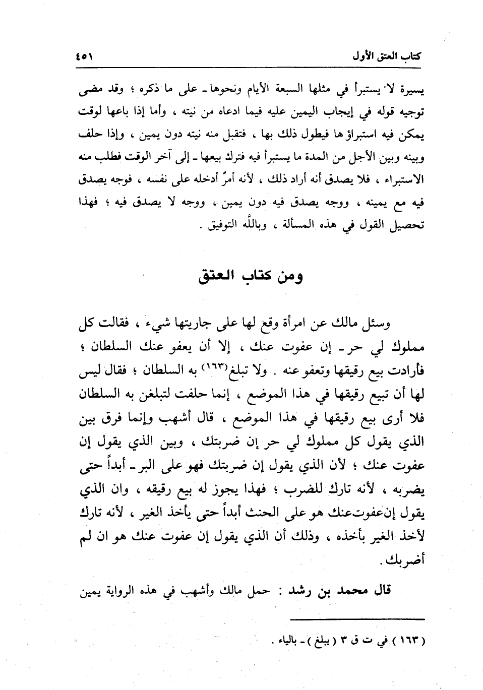 ومن كتاب العتق وسئل مالك: عن امرأة وقع لها على جاريتها شيء، فقالت: كل مملوك لي حر- إن عفوت عنك، إلا أن يعفو عنك السلطان، فأرادت بيع رقيقها وتعفو عنه، ولا تبلغ به السلطان، فقال: ليس لها أن تبيع رقيقها في هذا الموضع، إنما حلفت لتبلغن به السلطان فلا أرى بيع رقيقها في هذا الموضع، قال أشهب: وإنما فرق بين الذي يقول كل مملوك لي حر إن ضربتك، وبين الذي يقول: إن عفوت عنك؛ لأن الذي يقول: إن ضربتك فهو على البر- أبدا حتى يضربه؛ لأنه تارك للضرب، فهذا يجوز له بيع رقيقه، وأن الذي يقول: إن عفوت عنك هو على الحنث أبدا حتى يأخذ الغير؛ لأنه تارك لأخذ الغير بأخذه، وذلك أن الذي يقول: إن عفوت عنك هو إن لم أضربك.