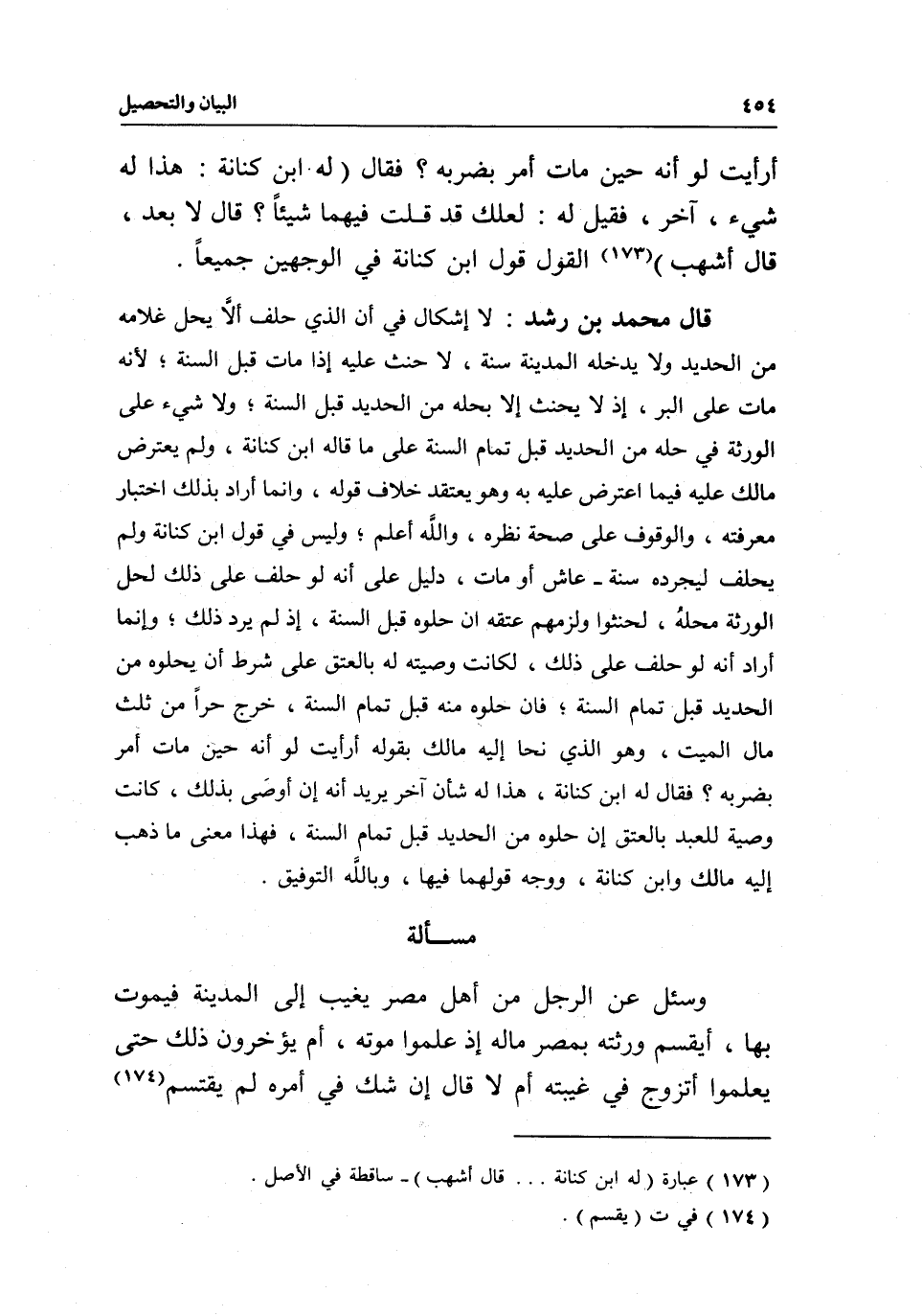 قال محمد بن رشد: لا إشكال في أن الذي حلف ألا يحل غلامه من الحديد ولا يدخله المدينة سنة، لا حنث عليه إذا مات قبل السنة؛ لأنه مات على البر، إذ لا يحنث إلا بحله من الحديد قبل السنة، ولا شيء على الورثة في حله من الحديد قبل تمام السنة على ما قاله ابن كنانة، ولم يعترض مالك عليه فيما اعترض عليه به وهو يعتقد خلاف قوله، وإنما أراد بذلك اختبار معرفته، والوقوف على صحة نظره، والله أعلم، وليس في قول ابن كنانة ولم يحلف ليجرده سنة- عاش أو مات، دليل على أنه لو حلف على ذلك لحل الورثة محله، لحنثوا ولزمهم عتقه إن حلوه قبل السنة، إذ لم يرد ذلك، وإنما أراد أنه لو حلف على ذلك، لكانت وصيته له بالعتق على شرط أن يحلوه من الحديد قبل تمام السنة، فإن حلوه منه قبل تمام السنة، خرج حرا من ثلث مال الميت، وهو الذي نحا إليه مالك بقوله: أرأيت لو أنه حين مات أمر بضربه؟ فقال له ابن كنانة: هذا له شأن أخر يريد أنه إن أوصى بذلك، كانت وصية للعبد بالعتق إن حلوه من الحديد قبل تمام السنة، فهذا معنى ما ذهب إليه مالك وابن كنانة، ووجه قولهما فيها، وبالله التوفيق.