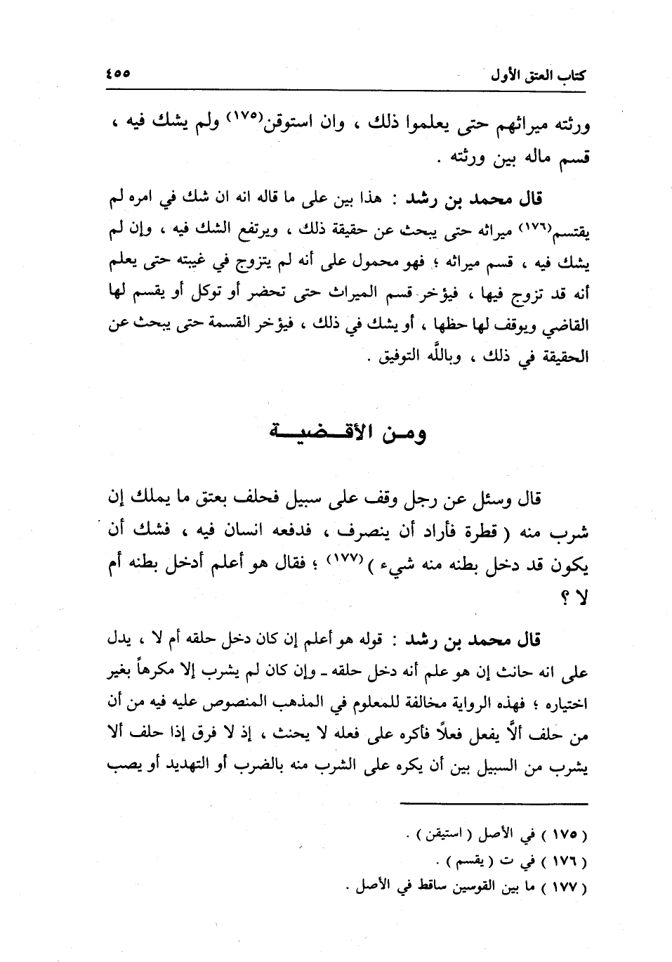 ومن الأقضية قال: وسئل عن رجل وقف على سبيل فحلف بعتق ما يملك إن شرب منه (قطرة فأراد أن ينصرف، فدفعه إنسان فيه، فشك أن يكون قد دخل بطنه منه شيء) ، فقال: هو أعلم أدخل بطنه أم لا؟ قال محمد بن رشد: قوله: هو أعلم إن كان دخل حلقه أم لا، يدل على أنه حانث إن هو علم أنه دخل حلقه- وإن كان لم يشرب إلا مكرها بغير اختياره، فهذه الرواية مخالفة للمعلوم في المذهب المنصوص عليه فيه من أن من حلف ألا يفعل فعلا فأكره على فعله لا يحنث، إذ لا فرق إذا حلف ألا يشرب من السبيل بين أن يكره على الشرب منه بالضرب أو التهديد أو يصب