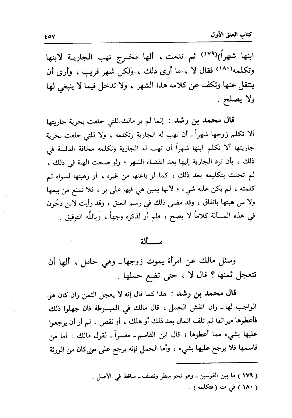 مسألة وسئل مالك: عن امرأة يموت زوجها- وهي حامل، ألها أن تتعجل ثمنها؟ قال: لا، حتى تضع حملها.