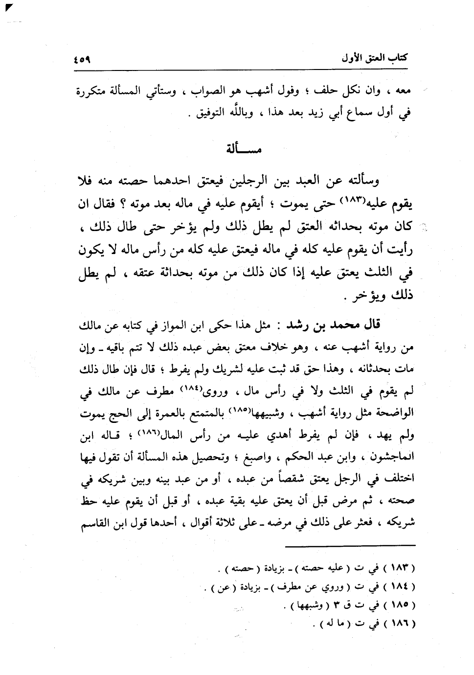 قال محمد بن رشد: مثل هذا حكى ابن المواز في كتابه عن مالك من رواية أشهب عنه، وهو خلاف معتق بعض عبده ذلك لا تتم باقيه- وإن مات بحدثانه، وهذا حق قد ثبت عليه لشريك ولم يفرط، قال: فإن طال ذلك لم يقوم قي الثلث ولا في رأس مال، وروى مطرف عن مالك في الواضحة مثل رواية أشهب، وشبيهها بالمتمتع بالعمرة إلى الحج يموت ولم يهد، فإن لم يفرط أهدي عليه من رأس المال، قاله ابن الماجشون، وابن عبد الحكم، وأصبغ، وتحصيل هذه المسألة أن تقول فيها: اختلف في الرجل يعتق شقصا من عبده، أو من عبد بينه وبين شريكه في صحته، ثم مرض قبل أن يعتق عليه بقية عبده، أو قبل أن يقوم عليه حظ شريكه، فعثر على ذلك في مرضه- على ثلاثة أقوال؛ أحدها: قول ابن القاسم