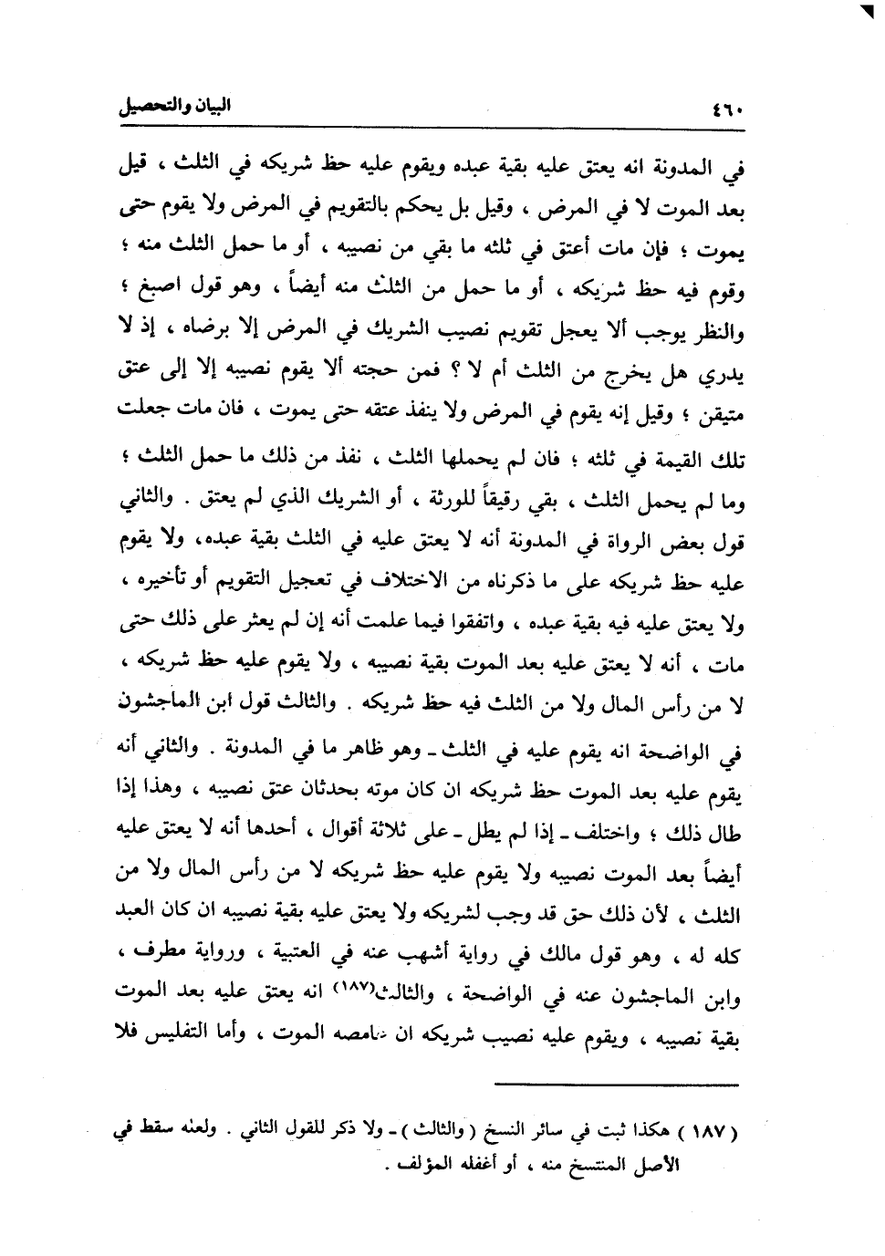 والثاني: أنه يقوم عليه بعد الموت حظ شريكه إن كان موته بحدثان عتق نصيبه، وهذا إذا طال ذلك، واختلف- إذا لم يطل- على ثلاثة أقوال؛ أحدها: أنه لا يعتق عليه أيضا بعد الموت بقية نصيبه ولا يقوم عليه حظ شريكه لا من رأس المال ولا من الثلث؛ لأن ذلك حق قد وجب لشريكه ولا يعتق عليه بقية نصيبه إن كان العبد كله له، وهو قول مالك في رواية أشهب عنه في العتبية، ورواية مطرف، وابن الماجشون عنه في الواضحة.