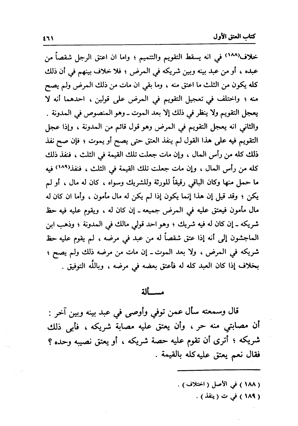خلاف في أنه يسقط التقويم والتتميم، وأما إن أعتق الرجل شقصا من عبده، أومن عبد بينه وبين شريكه في المرض، فلا خلاف بينهم في أن ذلك كله يكون من الثلث ما أعتق منه، وما بقي إن مات من ذلك المرض ولم يصح منه، واختلف في تعجيل التقويم في المرض على قولين؛ أحدهما: أنه لا يعجل التقويم ولا ينظر في ذلك إلا بعد الموت- وهو المنصوص في المدونة.