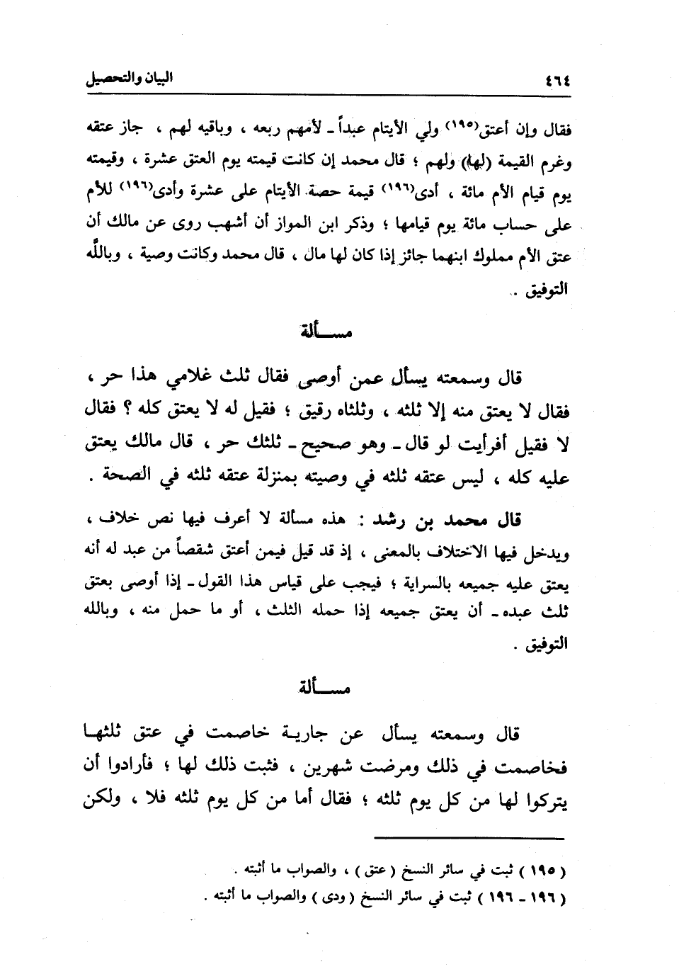 فقال: وإن أعتق ولي الأيتام عبدا- لأمهم ربعه، وباقيه لهم، جاز عتقه وغرم القيمة (لها) ولهم، قال محمد: إن كانت قيمته يوم العتق عشرة، وقيمته يوم قيام الأم مائة، أدى قيمة حصة الأيتام على عشرة وأدى للأم على حساب مائة يوم قيامها، وذكر ابن المواز أن أشهب روى عن مالك: أن عتق الأم مملوك ابنهما جائز إذا كان لها مال، قال محمد: وكانت وصية، وبالله التوفيق.