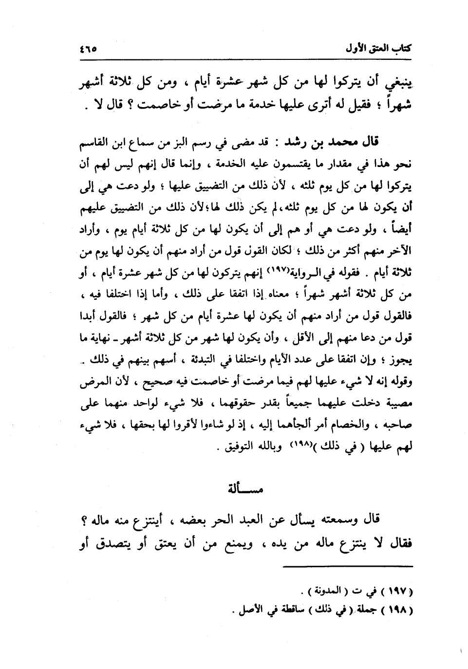 قال محمد بن رشد: قد مضى في رسم البز من سماع ابن القاسم نحو هذا في مقدار ما يقتسمون عليه الخدمة، وإنما قال: إنهم ليس لهم أن يتركوا لها من كل يوم ثلثه؛ لأن ذلك من التضييق عليها، ولو دعت هي إلى أن يكون لها من كل يوم ثلثه، لم يكن ذلك لها؛ لأن ذلك من التضييق عليهم أيضا، ولو دعت هي أو هم إلى أن يكون لها من كل ثلاثة أيام يوم، وأراد الآخر منهم أكثر من ذلك، لكان القول قول من أراد منهم أن يكون لها يوم من ثلاثة أيام، فقوله في الرواية: إنهم يتركون لها من كل شهر عشرة أيام، أو من كل ثلاثة أشهر شهرا، معناه إذا اتفقا على ذلك، وأما إذا اختلفا فيه، فالقول قول من أراد منهم أن يكون لها عشرة أيام من كل شهر، فالقول أبدا قول من دعا منهم إلى الأقل، وأن يكون لها شهر من كل ثلاثة أشهر- نهاية ما يجوز، وإن اتفقا على عدد الأيام واختلفا في التبدئة، أسهم بينهم في ذلك.