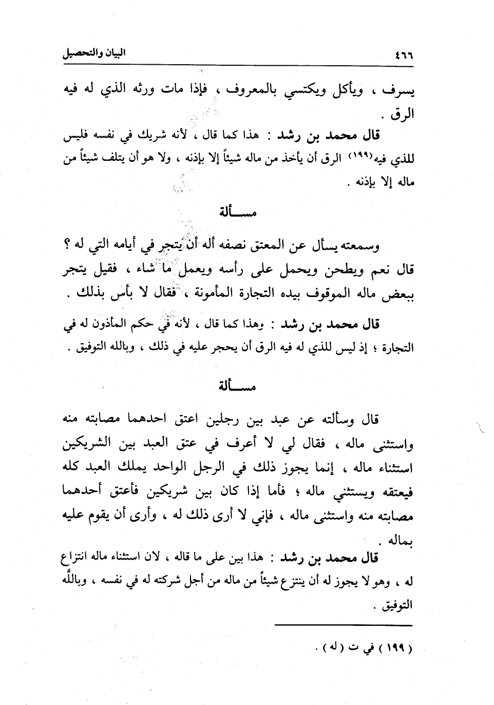 قال محمد بن رشد: هذا كما قال؛ لأنه شريك في نفسه فليس للذي فيه الرق أن يأخذ من ماله شيئا إلا بإذنه، ولا هو أن يتلف شيئا من ماله إلا بإذنه.