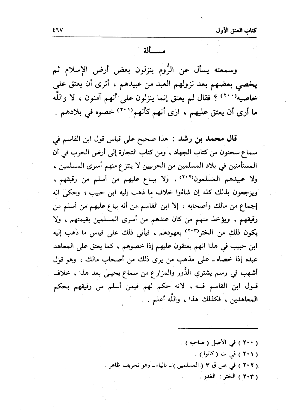 مسألة وسمعته يسأل: عن الروم ينزلون بعض أرض الإسلام ثم يخصي بعضهم بعد نزولهم العبد من عبيدهم، أترى أن يعتق على خاصيه؟ فقال: لم يعتق إنما ينزلون على أنهم آمنون، لا والله ما أرى أن يعتق عليهم، أرى أنهم كأنهم خصوه في بلادهم.