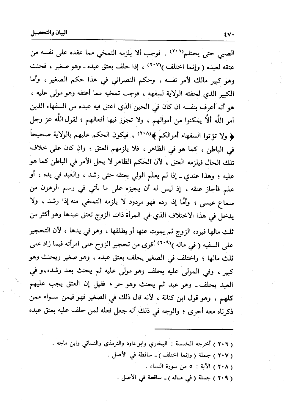 الصبي حتى يحتلم، فوجب ألا يلزمه التمخي مما عقده على نفسه من عتقه لعبده (وإنما اختلف) ، إذا حلف بعتق عبده- وهو صغير، فحنث وهو كبير مالك لأمر نفسه، وحكم النصراني في هذا حكم الصغير، وأما الكبير الذي لحقته الولاية لسفهه، فوجب تمخيه مما أعتقه وهو مولى عليه، هو أنه أعرف بنفسه إن كان في الحين الذي أعتق فيه عبده من السفهاء الذين أمر الله ألا يمكنوا من أموالهم، ولا تجوز فيها أفعالهم؛ لقول الله عز وجل: {وَلا تُؤْتُوا السُّفَهَاءَ أَمْوَالَكُمُ} [النساء: 5] ، فيكون الحكم عليهم بالولاية صحيحا في الباطن، كما هو في الظاهر، فلا يلزمهم العتق، وإن كان على خلاف تلك الحال فيلزمه العتق؛ لأن الحكم الظاهر لا يحل الأمر في الباطن كما هو عليه، وهذا عندي- إذا لم يعلم الولي بعتقه حتى رشد، والعبد في يده، أو علم فأجاز عتقه، إذ ليس له أن يجيزه على ما يأتي في رسم الرهون من سماع عيسى، وأما إذا رده فهو مردود لا يلزمه التمخي منه إذا رشد، ولا يدخل في هذا الاختلاف الذي في المرأة ذات الزوج تعتق عبدها وهو أكثر من ثلث مالها فيرده الزوج ثم يموت عنها أو يطلقها، وهو في يدها؛ لأن التحجير على السفيه (في ماله) أقوى من تحجير الزوج على امرأته فيما زاد على ثلث مالها، واختلف في الصغير يحلف بعتق عبده، وهو صغير ويحنث وهو كبير، وفي المولى عليه يحلف وهو مولى عليه ثم يحنث بعد رشده، وفي العبد يحلف- وهو عبد ثم يحنث وهو حرث، فقيل: إن العتق يجب عليهم كلهم، وهو قول ابن كنانة؛ لأنه قال ذلك في الصغير فهو فيمن سواه ممن ذكرناه معه أحرى، والوجه في ذلك أنه جعل فعله لمن حلف عليه بعتق عبده