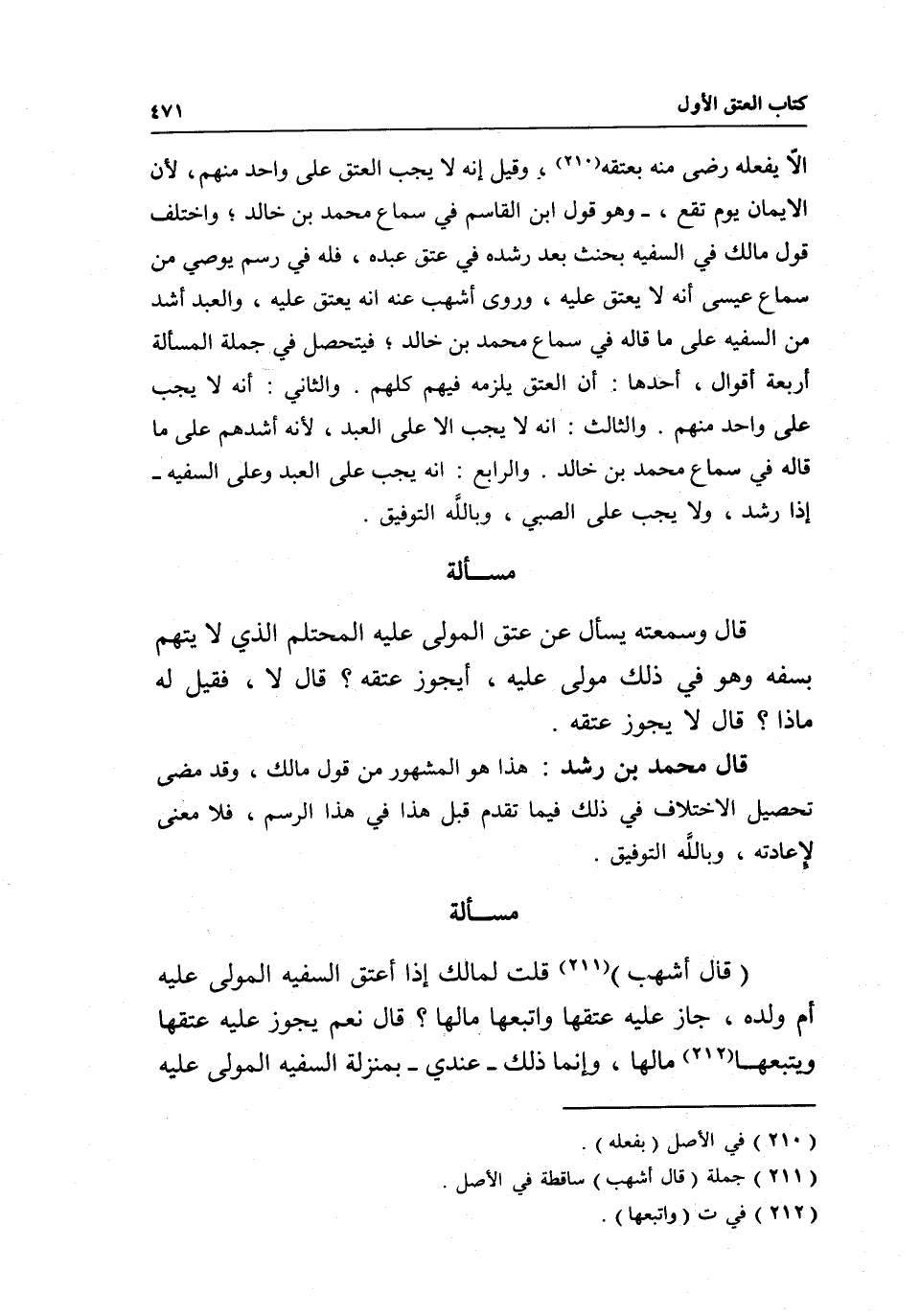 قال محمد بن رشد: هذا هو المشهور من قول مالك، وقد مضى تحصيل الاختلاف في ذلك فيما تقدم قبل هذا في هذا الرسم، فلا معنى لإعادته، وبالله التوفيق.