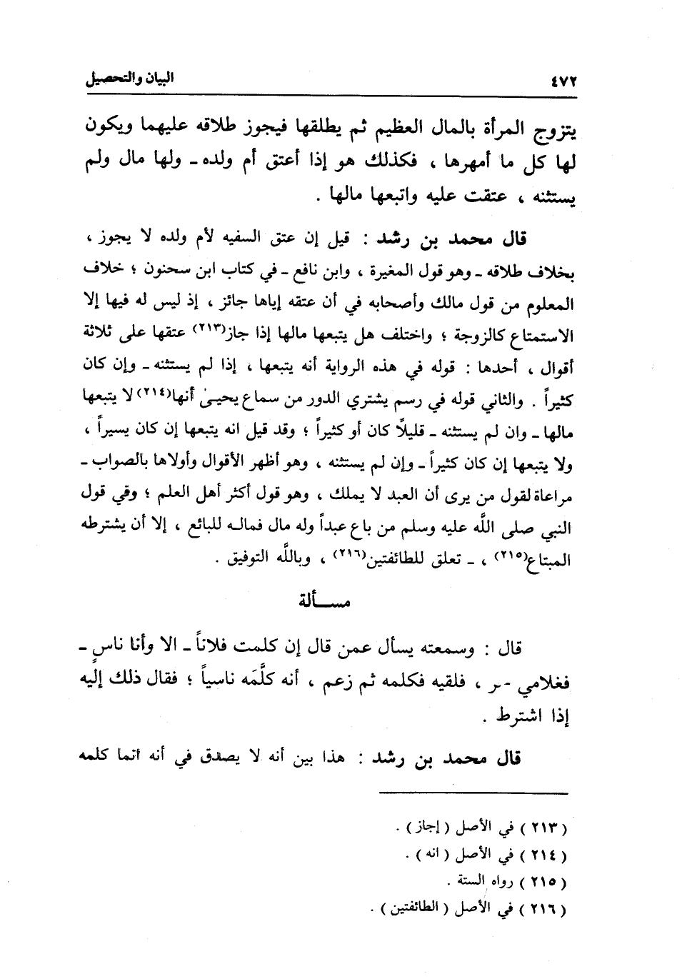 قال محمد بن رشد: قيل: إن عتق السفيه لأم ولده لا يجوز، بخلاف طلاقه- وهو قول المغيرة، وابن نافع - في كتاب ابن سحنون، خلاف المعلوم من قول مالك وأصحابه في أن عتقه إياها جائز، إذ ليس له فيها إلا الاستمتاع كالزوجة، واختلف هل يتبعها مالها إذا جاز عتقها على ثلاثة أقوال؛ أحدها: قوله في هذه الرواية: أنه يتبعها، إذا لم يستثنه- وإن كان كثيرا.