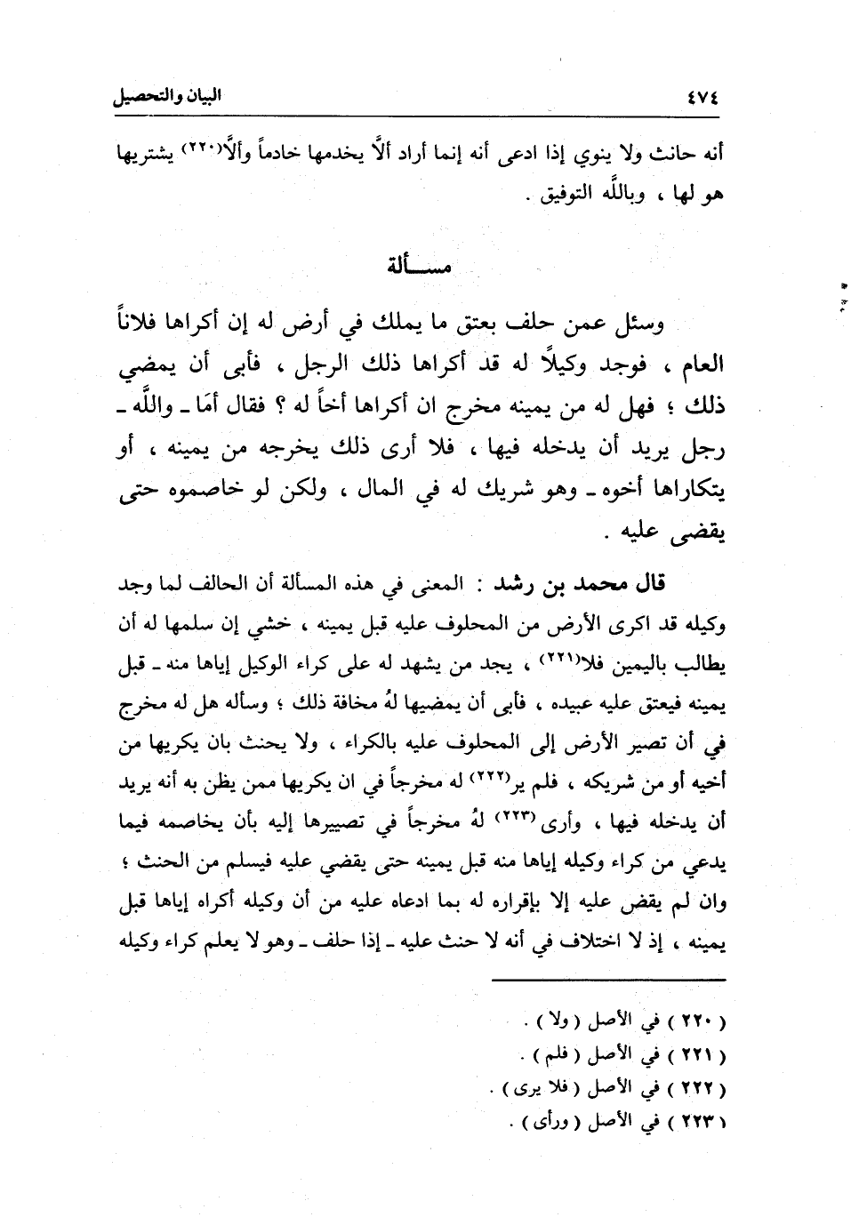 قال محمد بن رشد: المعنى في هذه المسألة أن الحالف لما وجد وكيله قد أكرى الأرض من المحلوف عليه قبل يمينه، خشي إن سلمها له أن يطالب باليمين فلا، يجد من يشهد له على كراء الوكيل إياها منه- قبل يمينه فيعتق عليه عبيده، فأبى أن يمضيها له مخافة ذلك، وسأله هل له مخرج في أن تصير الأرض إلى المحلوف عليه بالكراء، ولا يحنث بأن يكريها من أخيه أو من شريكه، فلم ير له مخرجا في أن يكريها ممن يظن به أنه يريد أن يدخله فيها، وأرى له مخرجا في تصييرها إليه بأن يخاصمه فيما يدعي من كراء وكيله إياها منه قبل يمينه حتى يقضي عليه فيسلم من الحنث، وإن لم يقض عليه إلا بإقراره له بما ادعاه عليه من أن وكيله أكراه إياها قبل يمينه، إذ لا اختلاف في أنه لا حنث عليه- إذا حلف- وهو لا يعلم كراء وكيله