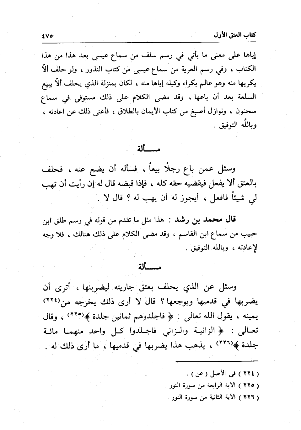مسألة وسئل: عن الذي يحلف بعتق جاريته ليضربنها، أترى أن يضربها في قدميها ويوجعها؟ قال: لا أرى ذلك يخرجه من يمينه، يقول الله تعالى: {فَاجْلِدُوهُمْ ثَمَانِينَ جَلْدَةً} [النور: 4] ، وقال تعالى: {الزَّانِيَةُ وَالزَّانِي فَاجْلِدُوا كُلَّ وَاحِدٍ مِنْهُمَا مِائَةَ جَلْدَةٍ} [النور: 2] ، يذهب هذا يضربها في قدميها، ما أرى ذلك له.
