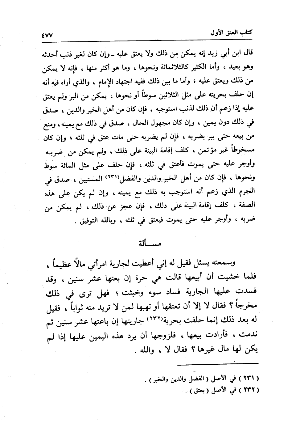 قال ابن أبي زيد: إنه يمكن من ذلك ولا يعتق عليه- وإن كان لغير ذنب أحدثه وهو بعيد، وأما الكثير كالثلاثمائة ونحوها، وما هو أكثر منها، فإنه لا يمكن من ذلك ويعتق عليه، وأما ما بين ذلك ففيه اجتهاد الإمام، والذي أراه فيه أنه إن حلف بحريته على مثل الثلاثين سوطا أو نحوها، يمكن من البر ولم يعتق عليه إذا زعم أن ذلك لذنب استوجبه، فإن كان من أهل الخير والدين، صدق في ذلك دون يمين، وإن كان مجهول الحال، صدق في ذلك مع يمينه، ومنع من بيعه حتى يبر بضربه، فإن لم يضربه حتى مات عتق في ثلثه، وإن كان مسخوطا غير مؤتمن، كلف إقامة البينة على ذلك، ولم يمكن من ضربه وأوجر عليه حتى يموت فأعتق في ثلثه، فإن حلف على مثل المائة سوط ونحوها، فإن كان من أهل الخير والدين والفضل المستبين، صدق في الجرم الذي زعم أنه استوجب به ذلك مع يمينه، وإن لم يكن على هذه الصفة، كلف إقامة البينة على ذلك، فإن عجز عن ذلك، لم يمكن من ضربه، وأوجر عليه حتى يموت فيعتق في ثلثه، وبالله التوفيق.
