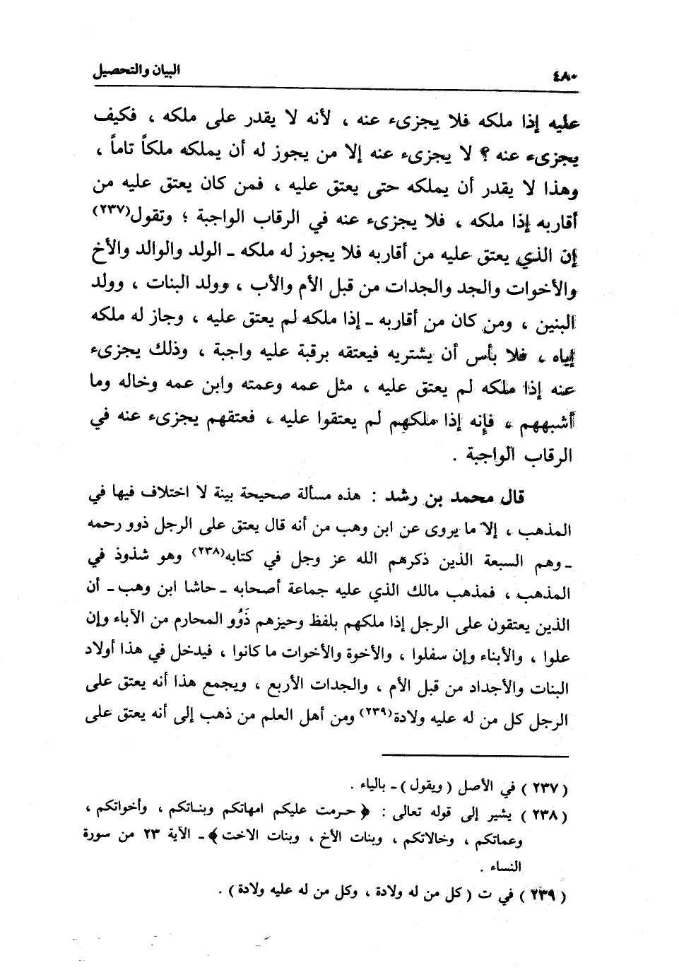 قال محمد بن رشد: هذه مسألة صحيحة بينة لا اختلاف فيها في المذهب، إلا ما يروى عن ابن وهب من أنه قال: يعتق على الرجل ذوو رحمه - وهم السبعة الذين ذكرهم الله عز وجل في كتابه وهو شذوذ في المذهب، فمذهب مالك الذي عليه جماعة أصحابه- حاشا ابن وهب - أن الذين يعتقون على الرجل إذا ملكهم بلفظ وحيزهم ذوو المحارم من الآباء وإن علوا، والأبناء وإن سفلوا، والأخوة والأخوات ما كانوا، فيدخل في هذا أولاد البنات والأجداد من قبل الأم، والجدات الأربع، ويجمع هذا أنه يعتق على الرجل كل من له عليه ولادة ومن أهل العلم من ذهب إلى أنه يعتق على