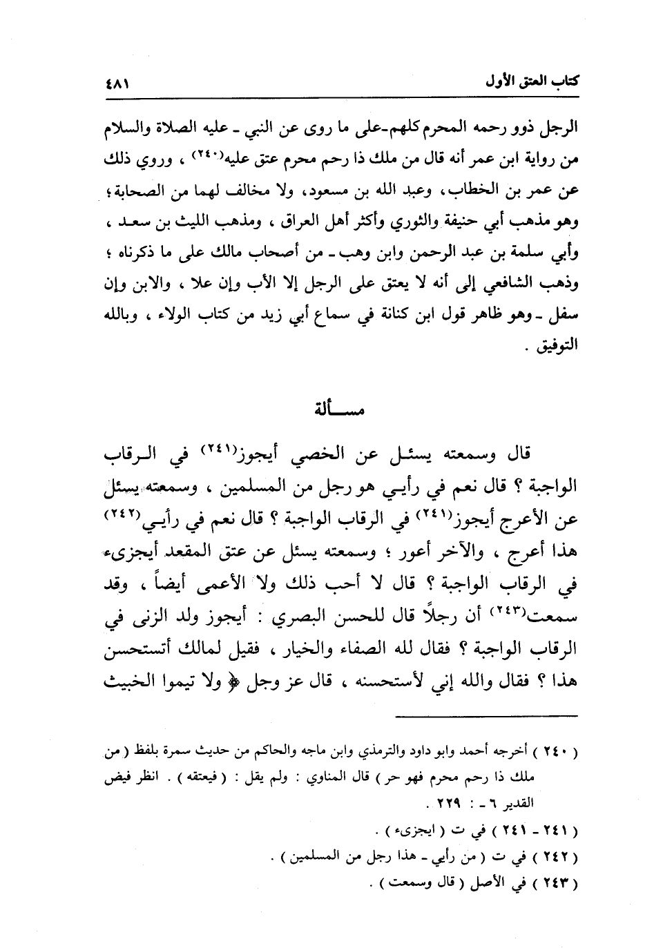 مسألة قال: وسمعته يسأل عن الخصي أيجوز في الرقاب الواجبة؟ قال: نعم في رأيي هو رجل من المسلمين، وسمعته يسأل عن الأعرج أيجوز في الرقاب الواجبة؟ قال: نعم في رأيي هذا أعرج، والآخر أعور، وسمعته يسأل عن عتق المقعد أيجزئ في الرقاب الواجبة؟ قال: لا أحب ذلك ولا الأعمى أيضا، وقد سمعت أن رجلا قال للحسن البصري: أيجوز ولد الزنى في الرقاب الواجبة؟ فقال: لله الصفاء والخيار، فقيل لمالك: أتستحسن هذا؟ فقال: والله إني لأستحسنه، قال عز وجل: {وَلا تَيَمَّمُوا الْخَبِيثَ مِنْهُ تُنْفِقُونَ} [البقرة: 267]