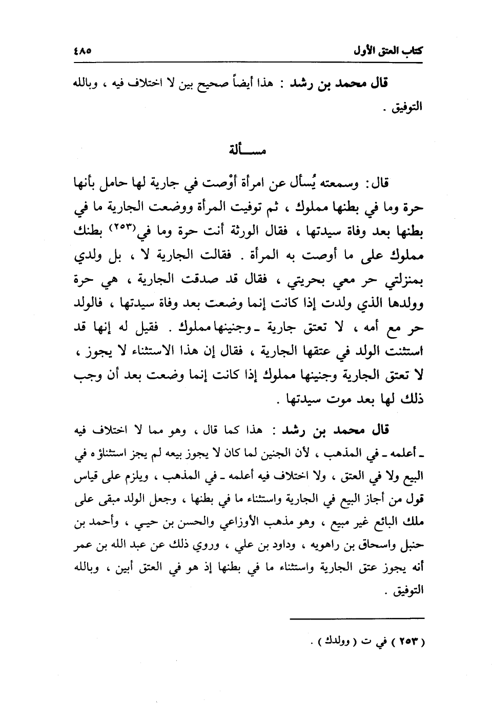 مسألة قال: وسمعته يسأل: عن امرأة أوصت في جارية لها حامل بأنها حرة وما في بطنها مملوك، ثم توفيت المرأة ووضعت الجارية ما في بطنها بعد وفاة سيدتها، فقال الورثة: أنت حرة وما في بطنك مملوك على ما أوصت به المرأة، فقالت الجارية: لا، بل ولدي بمنزلتي حر معي بحريتي، فقال: قد صدقت الجارية، هي حرة وولدها الذي ولدت إذا كانت إنما وضعت بعد وفاة سيدتها، فالولد حر مع أمه، لا تعتق جارية- وجنينها مملوك، فقيل له: إنها قد استثنت الولد في عتقها الجارية، فقال: إن هذا الاستثناء لا يجوز، لا تعتق الجارية وجنينها مملوك إذا كانت إنما وضعت بعد أن وجب ذلك لها بعد موت سيدتها.