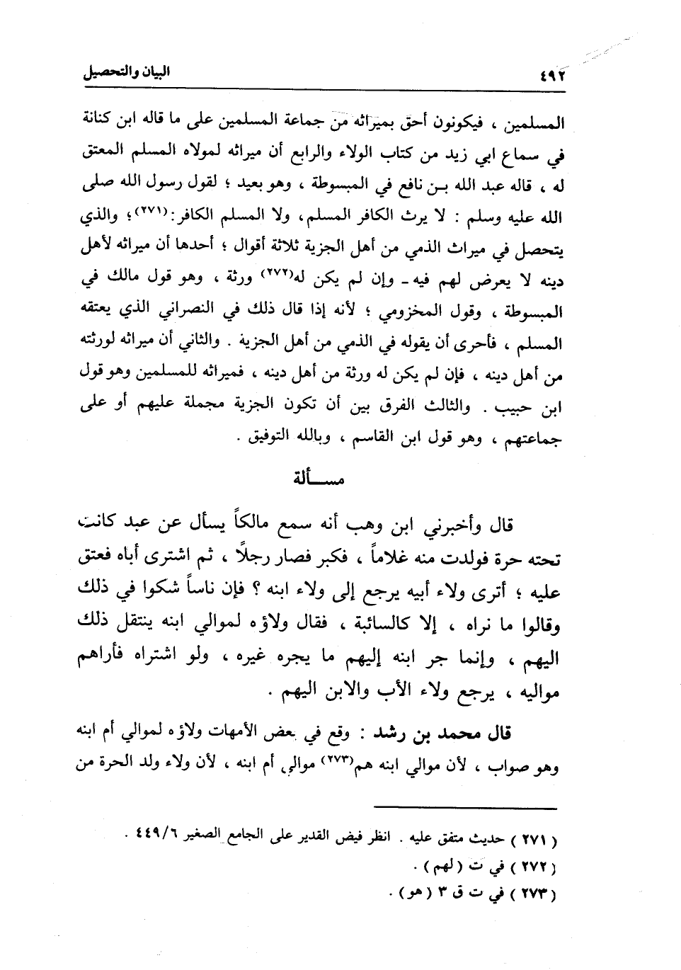 المسلمين، فيكونون أحق بميراثه من جماعة المسلمين على ما قاله ابن كنانة في سماع أبي زيد من كتاب الولاء والرابع: أن ميراثه لمولاه المسلم المعتق له، قاله عبد الله بن نافع في المبسوطة، وهو بعيد، لقول رسول الله - صَلَّى اللَّهُ عَلَيْهِ وَسَلَّمَ -: «لا يرث الكافر المسلم، ولا المسلم الكافر» والذي يتحصل في ميراث الذمي من أهل الجزية ثلاثة أقوال؛ أحدها: أن ميراثه لأهل دينه لا يعرض لهم فيه- وإن لم يكن له ورثة، وهو قول مالك في المبسوطة، وقول المخزومي؛ لأنه إذا قال ذلك في النصراني الذي يعتقه المسلم، فأحرى أن يقوله في الذمي من أهل الجزية.