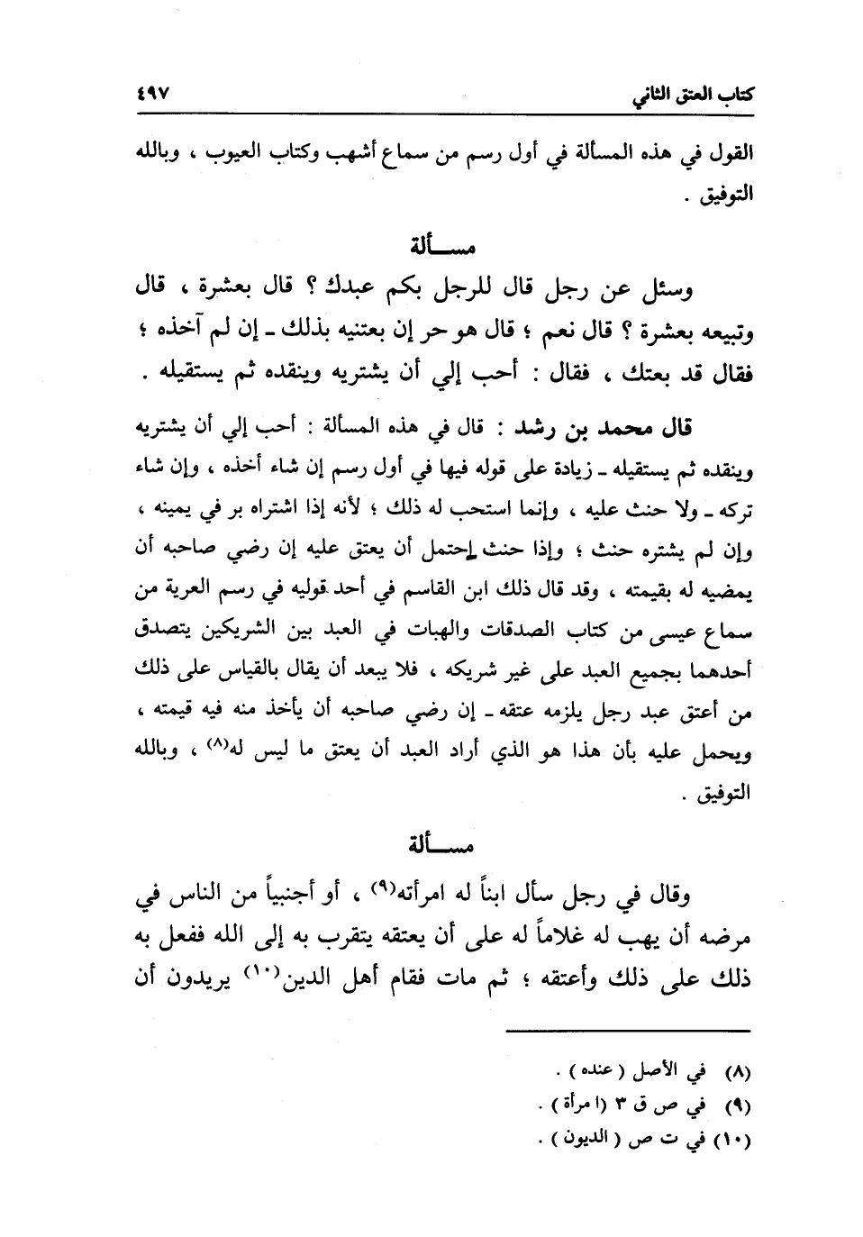مسألة وسئل: عن رجل قال للرجل: بكم عبدك؟ قال: بعشرة، قال: وتبيعه بعشرة، قال: نعم، قال هو حر إن بعتنيه بذلك - إن لم آخذه، فقال: قد بعتك، فقال: أحب إلي أن يشتريه وينقده ثم يستقيله.
