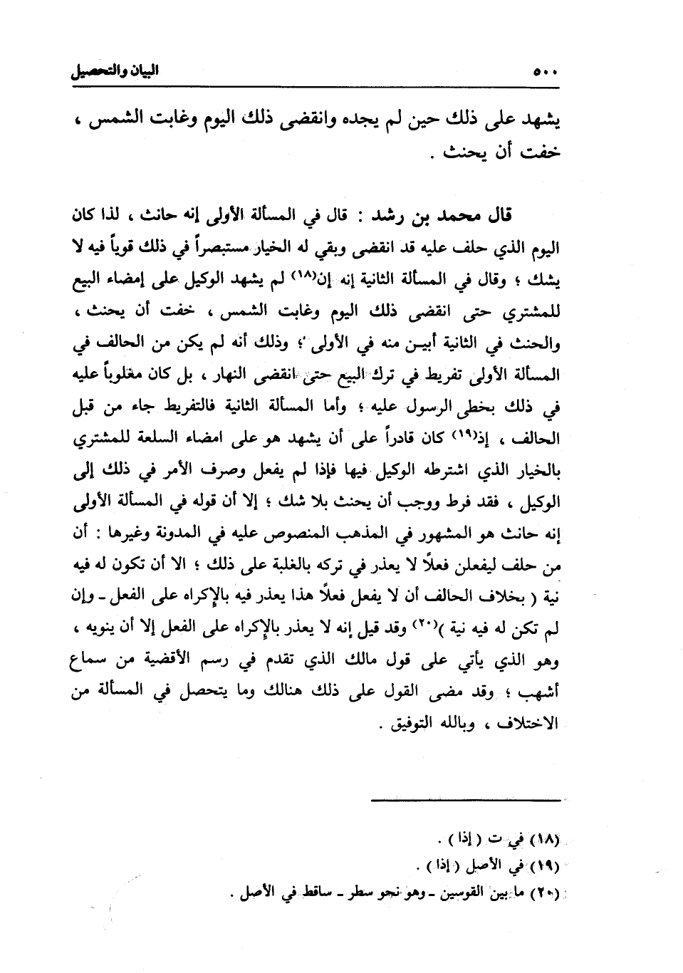 قال محمد بن رشد: قال في المسألة الأولى: إنه حانث، لذا كان اليوم الذي حلف عليه قد انقضى وبقي له الخيار مستبصرا في ذلك قويا فيه لا يشك، وقال في المسألة الثانية: إنه إن لم يشهد الوكيل على إمضاء البيع للمشتري حتى انقضى ذلك اليوم وغابت الشمس، خفت أن يحنث، والحنث في الثانية أبين منه في الأولى، وذلك أنه لم يكن من الحالف في المسألة الأولى تفريط في ترك البيع حتى انقضى النهار، بل كان مغلوبا عليه في ذلك بخطى الرسول عليه، وأما المسألة الثانية فالتفريط جاء من قبل الحالف، إذ كان قادرا على أن يشهد هو على إمضاء السلعة للمشتري بالخيار الذي اشترطه الوكيل فيها فإذا لم يفعل وصرف الأمر في ذلك إلى الوكيل، فقد فرط ووجب أن يحنث بلا شك، إلا أن قوله في المسألة الأولى إنه حانث هو المشهور في المذهب المنصوص عليه في المدونة وغيرها: أن من حلف ليفعلن فعلا لا يعذر في تركه بالغلبة على ذلك، إلا أن تكون له فيه نية (بخلاف الحالف أن لا يفعل فعلا هذا يعذر فيه بالإكراه على الفعل- وإن لم تكن له فيه نية) وقد قيل: إنه لا يعذر بالإكراه على الفعل إلا أن ينويه، وهو الذي يأتي على قول مالك الذي تقدم في رسم الأقضية من سماع أشهب، وقد مضى القول على ذلك هنالك وما يتحصل في المسألة من الاختلاف، وبالله التوفيق.