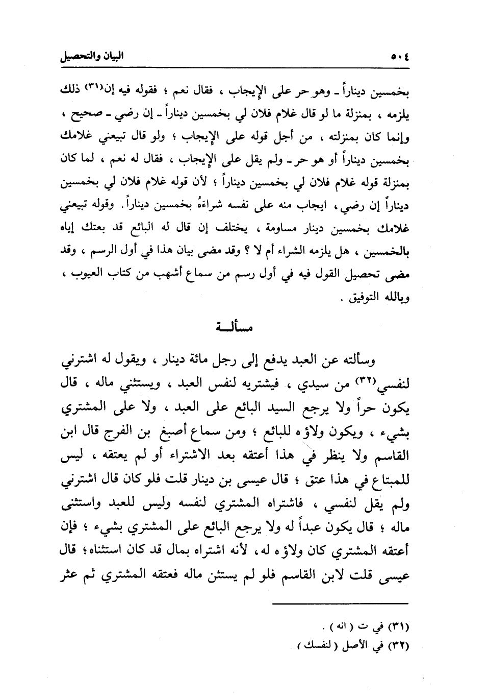 بخمسين دينارا- وهو حر على الإيجاب، فقال: نعم، فقوله فيه: إن ذلك يلزمه، بمنزلة ما لو قال غلام فلان لي بخمسين دينارا- إن رضي- صحيح، وإنما كان بمنزلته، من أجل قوله على الإيجاب، ولو قال: تبيعني غلامك بخمسين دينارا أو هو حر- ولم يقل على الإيجاب، فقال له: نعم، لما كان بمنزلة قوله: غلام فلان لي بخمسين دينارا؛ لأن قوله: غلام فلان لي بخمسين دينارا إن رضي، إيجاب منه على نفسه شراءه بخمسين دينارا. وقوله: تبيعني غلامك بخمسين دينارا مساومة، يختلف إن قال له البائع: قد بعتك إياه بالخمسين، هل يلزمه الشراء أم لا؟ وقد مضى بيان هذا في أول الرسم، وقد مضى تحصيل القول فيه في أول رسم من سماع أشهب من كتاب العيوب، وبالله التوفيق.