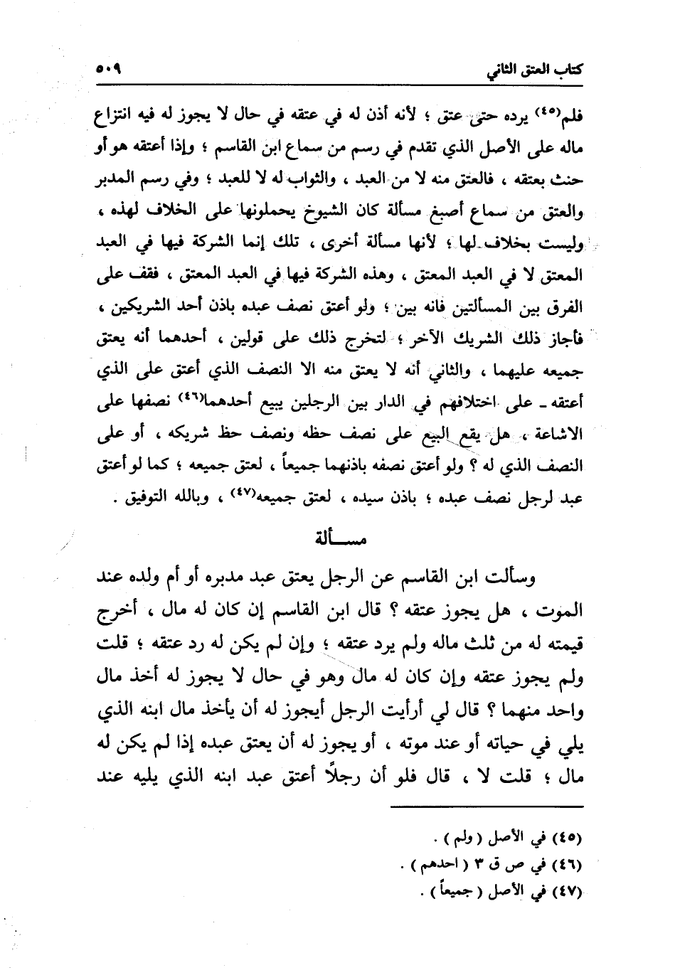مسألة وسألت ابن القاسم: عن الرجل يعتق عبد مدبره أو أم ولده عند الموت، هل يجوز عتقه؟ قال ابن القاسم: إن كان له مال، أخرج قيمته له من ثلث ماله ولم يرد عتقه، وإن لم يكن له رد عتقه، قلت: ولم يجوز عتقه وإن كان له مال وهو في حال لا يجوز له أخذ مال واحد منهما؟ قال لي: أرأيت الرجل أيجوز له أن يأخذ مال ابنه الذي يلي في حياته أو عند موته، أو يجوز له أن يعتق عبده إذا لم يكن له مال، قلت لا، قال: فلو أن رجلا أعتق عبد ابنه الذي يليه عند