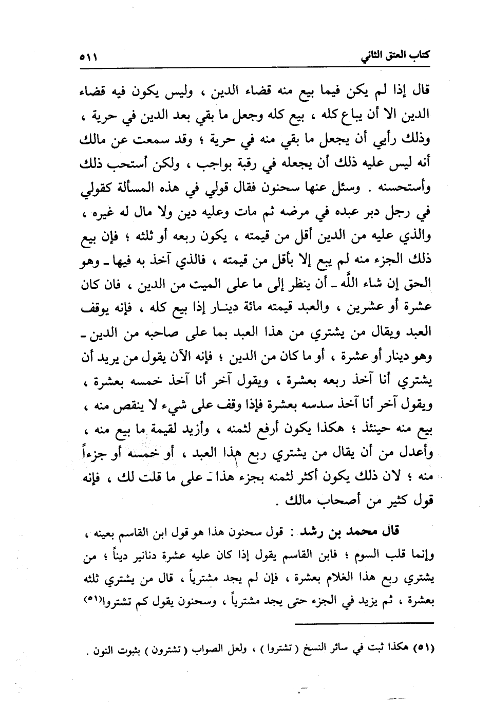 قال: إذا لم يكن فيما بيع منه قضاء الدين، وليس يكون فيه قضاء الدين إلا أن يباع كله، بيع كله وجعل ما بقي بعد الدين في حرية، وذلك رأيي أن يجعل ما بقي منه في حرية، وقد سمعت عن مالك أنه ليس عليه ذلك أن يجعله في رقبة بواجب، ولكن أستحب ذلك وأستحسنه.